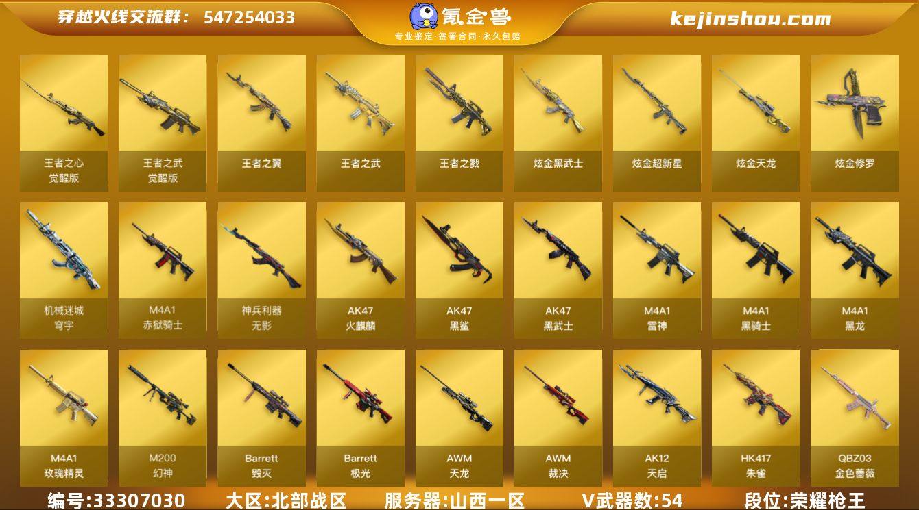 山西一区-62V-7王者武器数-4炫金武器数 【热门武器】:QBZ03-金色蔷薇,HK417-朱雀,M200-幻神,死亡之眼*3,金色小号,C.A.T,M4A1-黑骑士,汤姆逊-烈龙*4,RPK-盘龙,毁灭-孙三炮,沙鹰-修罗*5 【王者炫金武器】:王者之戮,王者之翼,王者之武,炫金武士,炫金超新星,炫金天龙,炫金修罗 【音效卡】:M4A1-雷神音效卡,M4A1-黑骑士音效卡,Barrett-毁灭音效卡 【皮肤】:幻神-宠儿-2021MVP,雷神-暗月,雷神-星空,火麒麟-雷神,火麒麟-心动糖果,毁灭-BEAN-2020MVP,黑骑士耀金皮肤,战神-紫绶金章皮肤,天龙-秘银 【角色】:葵,樱,瞳,零·纪元,战地猎狐,王者-瞳-闭月羞花,王者-零,王者涂鸦,乔伊教练,修道士,云海玲珑,暗夜-X,初恋灵狐,芳心审判者,风暴女*2,虎妞,嘉年华灵狐,灵狐者-X,龙儿,龙儿-小淘气,麻雀,萌儿,潘多拉-X,潘多拉-甜心教官,青霞仙子,蛇姬,斯沃特-X,兔囡囡,新娜塔莎,雪莉杨-摸金校尉,夜玫瑰-幻能朋克,幽 【人偶武器】:毁灭-孙三炮,火麒麟-灵狐,迷你宝贝*2,加特林-机械猎手,AWM-灵狐-15周年嘉年华,COP-旗袍,C.A.T,迷你深渊冰龙,迷你牛牛,生化手雷-机甲核心*2 【暴走生化】:死亡之眼*3 【挑战大师】:神圣爆裂者II...