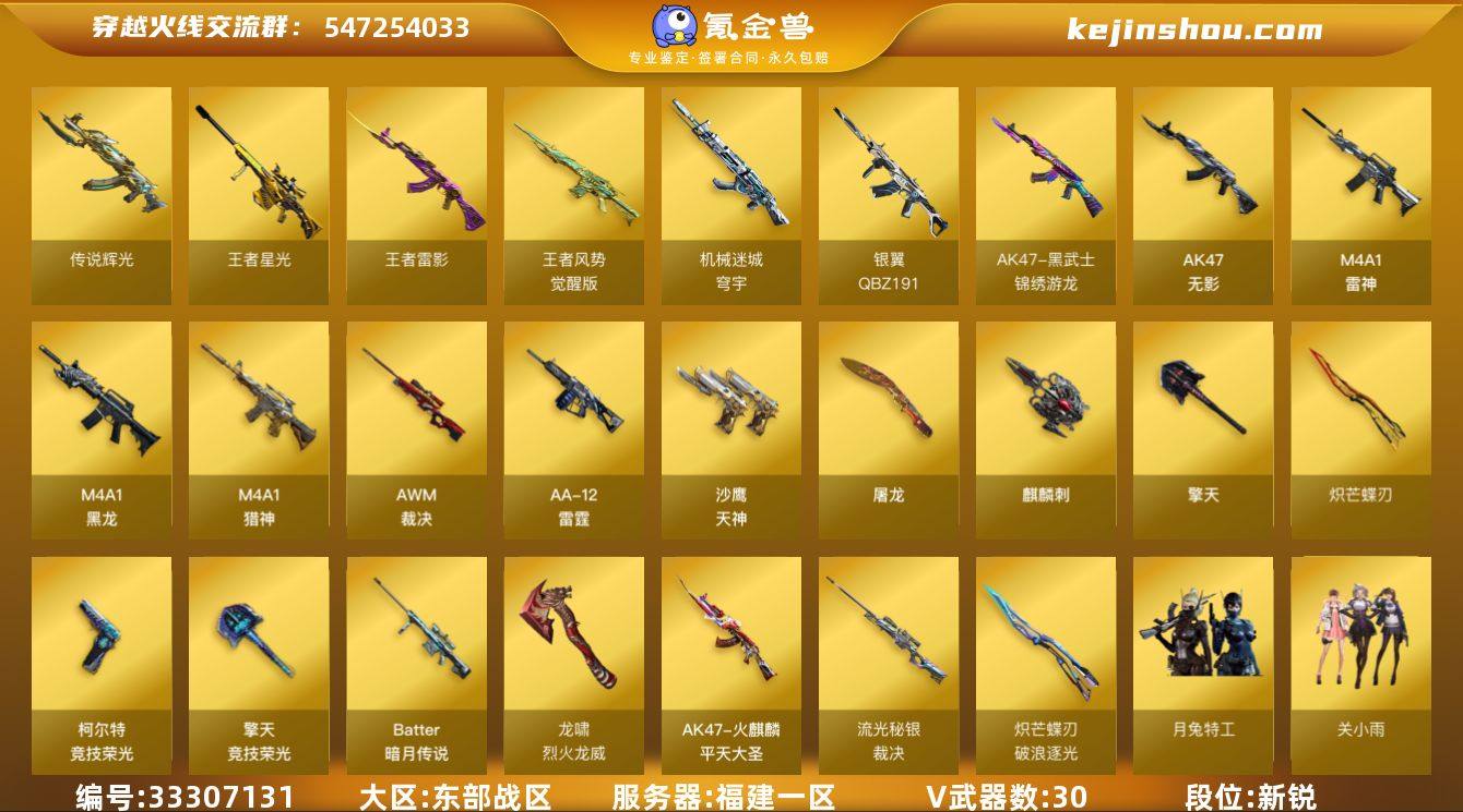 福建一区-33V-3王者武器数-0炫金武器数 【传说武器】:传说辉光 【热门武器】:传说辉光,死亡之眼,炽芒蝶刃,炽芒蝶刃-破浪逐光 皮肤 【王者炫金武器】:王者雷影,王者星光 【音效卡】:M4A1-雷神音效卡 【皮肤】:裁决-流光秘银,雷神-源计划2.0专属 皮肤,火麒麟-平天大圣,炽芒蝶刃-破浪逐光 皮肤 【角色】:月兔特工,关小雨,零·纪元,电竞少女,风暴女,龙儿,潘多拉-X,蜀雪,樱-战斗天使,影武者-X,游珑儿 【人偶武器】:火麒麟-灵狐,COP-旗袍,迷你牛牛,灵狐娃娃手雷 【暴走生化】:死亡之眼 【挑战大师】:AK47-冰龙粉碎者,激光毁灭者III-白马银枪 【英雄级武器】:M4A1-黑龙,M4A1-雷神*2,AK47-无影,黑武士-锦绣游龙,QBZ191-银翼,M4A1-猎神,王者风势-觉醒版,机械迷城-穹宇,AWM-裁决,Barrett-暗月传说,AA-12-雷霆,沙鹰-天神*5,柯尔特-竞技荣光,屠龙*2,擎天,麒麟刺*3,擎天-竞技荣光,炽芒蝶刃,龙啸-烈火龙威,高爆手雷-竞技荣光,闪光弹-竞技荣光,烟雾弹-竞技荣光 【源级武器】:源·火麒麟,源·雷神,魂·M4A1-雷神-化蛇,魂·雷神-诺拉,魂·雷神-神秘按键,源·武圣,魂·HK417-朱雀-凤灵,源-金色蔷薇,魂·9A91·烈火-电子连击,魂·英雄-湾区光...