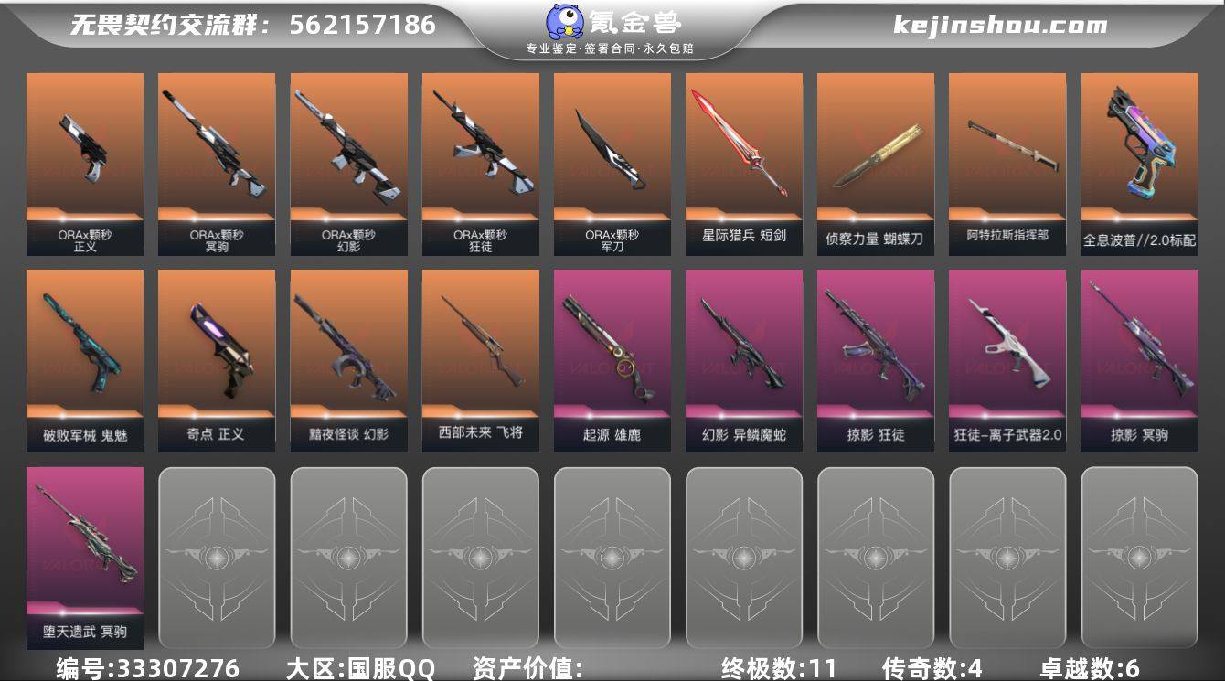 【套装】:ORA x 颗秒套装 【英雄】:炼狱,维斯,暮蝶,钛狐,壹决,铁臂,捷风,雷兹,幽影,不死鸟,贤者,猎枭,蝰蛇,零,芮娜,尚勃勒,霓虹,斯凯,夜露,K/O,盖可,黑梦 【近战武器】:近战武器-碎心裂刃,近战武器-ORA x 颗秒 军刀,近战武器-侦察力量 蝴蝶刀,近战武器-阿特拉斯指挥部 甩棍,近战武器-星际猎兵 短剑 【狂徒】:狂徒-ORA x 颗秒,狂徒-掠影,狂徒-离子武器//2.0 【幻影】:幻影-黯夜怪谈,幻影-ORA x 颗秒,幻影-异鳞魔蛇 【冥驹】:冥驹-ORA x 颗秒,冥驹-堕天遗武,冥驹-掠影 【飞将】:飞将-西部未来 【雄鹿】:雄鹿-起源 【骇灵】:骇灵-无限竞技 【标配】:标配-全息波普//2.0 【正义】:正义-奇点,正义-ORA x 颗秒 【鬼魅】:鬼魅-破败军械 【卡面】:热舞环节 卡面,失而复得 卡面,归乡 // 蝰蛇 卡面,树懒大作战 卡面,Clutch 卡面,暂别喧嚣 卡面,无畏契约GO!第一卷:芮娜 卡面,无畏契约GO!第一卷:零 卡面,《双城之战》金克丝 卡面,钢锁vs盖可 卡面,夯实根基 卡面,代号红色 卡面,新兵报到 卡面,V契约 卡面,无畏契约 卡面 【喷漆】:全力集中 喷漆,双人比心 喷漆,深海水族 喷漆,买装还是存钱 喷漆,无畏契约GO!第一卷:...