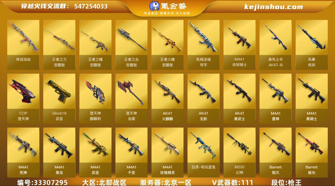北京一区-120V-6王者武器数-0炫金武器数 【传说武器】:传说浩劫 【热门武器】:传说浩劫,QBZ03-金色蔷薇,HK417-朱雀,M200-幻神,死亡之眼,荣耀世冠-火麒麟,白虎-电玩蓝兔,荣耀世冠-柯尔特,Kar98K-星神,M4A1-黑骑士,汤姆逊-烈龙*6,RPK-盘龙*3,加特林-炼狱,斯泰尔-蝴蝶,USP-雷暴,COP-堕天神,沙鹰-修罗*3,荣耀世冠-龙啸,金刚伞 【王者炫金武器】:王者之魄闪光弹*2 【音效卡】:M200-幻神音效卡,AK47-火麒麟音效卡,M4A1-雷神音效卡,M4A1-黑骑士音效卡,Barrett-毁灭音效卡,QBZ03-金色蔷薇音效卡 【皮肤】:幻神-冠军之幻,幻神-KZ-CFPLS25冠军 皮肤,裁决-运输船 皮肤,雷神-暗月,雷神-能量核心,雷神-荣耀之魄,火麒麟-雷神,火麒麟-平天大圣,毁灭-荣耀之怒,毁灭-星空,毁灭-冠军之怒,毁灭-风暴*2,毁灭-英雄计划 皮肤,M4A1-千变-孔明皮肤,黑龙-能量核心,黑龙-暗月,黑骑士耀金皮肤,黑骑士-地狱火,无影-能量核心,无影耀金皮肤,死神-秘银*2,战神-粉色甜心皮肤*2,战神-紫绶金章皮肤,战神-流金岁月皮肤,AK47-B-常胜将军-曹操*2,AK47-B-常胜将军-刘备,AK47-B-常胜将军-孙权,天龙-能量核心,AWM-天龙-传奇70KG,极光-能量核心,屠龙-惊鸿 皮...