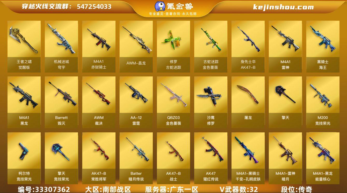广东一区-35V-2王者武器数-0炫金武器数 【热门武器】:QBZ03-金色蔷薇,金色蔷薇-古蛇迷踪,修罗-古蛇迷踪,M200-竞技荣光,USP-雷暴,沙鹰-修罗 【音效卡】:QBZ03-金色蔷薇音效卡,AWM-昌龙-怀旧音效卡 【皮肤】:裁决-叶芒苍灵 皮肤,雷神-暗月,雷神-源计划2.0专属 皮肤,火麒麟-平天大圣,毁灭-荣耀之怒,毁灭-虹光风暴 皮肤,M4A1-千变-孔明皮肤,黑龙-能量核心,战神-粉色甜心皮肤,战神-流金岁月皮肤*2,AK47-B-常胜将军-曹操,AK47-B-常胜将军-刘备 【角色】:电竞教官-云悠悠,零·纪元,战地猎狐,蛇隐宗,奇洋探员,乔伊教练,云海玲珑,暗夜-X,电竞少女,风暴女*2,娟娟,0号玩家,曼陀罗-X,潘多拉-X,蛇姬,兔囡囡,维纳斯,新娜塔莎,雪莉杨-摸金校尉,夜玫瑰-宠粉,影武者-X 【人偶武器】:COP-旗袍,迷你波特博士*6,生化手雷-机甲核心,深渊终结者手雷,闪光弹-小乔,闪光弹-貂蝉,高爆手雷-大乔 【挑战大师】:激光毁灭者III-白马银枪*2,试炼破坏者III 【英雄级武器】:M4A1-黑龙,M4A1-雷神,QBZ03-金色蔷薇,金色蔷薇-古蛇迷踪,AK-47-猩红传说*2,黑骑士-海王,AK47-B-常胜将军,机械迷城-穹宇,AK47-B-身先士卒,AK47-B-战士,Barrett-毁灭,AWM-裁...
