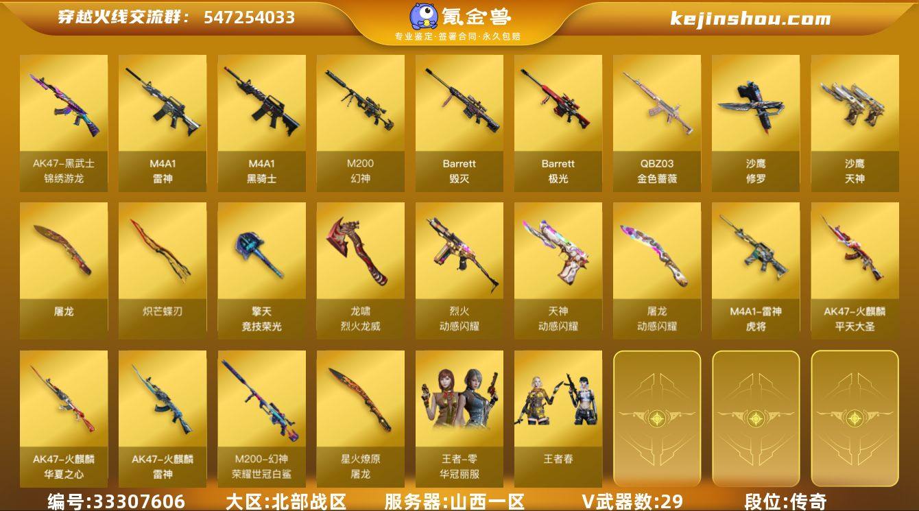 江西一区-29V-1王者武器数-0炫金武器数 【热门武器】:QBZ03-金色蔷薇,M4A1-青龙,M200-幻神,死亡之眼,M4A1-黑骑士,沙鹰-修罗,炽芒蝶刃 【音效卡】:Barrett-毁灭音效卡 【皮肤】:M200-幻神-荣耀世冠白鲨,雷神-虎将,火麒麟-雷神,火麒麟-华夏之心,火麒麟-平天大圣,毁灭-虹光风暴 皮肤,屠龙-星火燎原 【角色】:王者零-华冠丽服,王者春,奇洋探员,乔伊教练,暗夜-X,飞虎队-X,灵狐者-X,麻雀,萌儿,潘多拉-X,蜀雪,兔囡囡,新娜塔莎,游珑儿 【人偶武器】:AWM-灵狐-15周年嘉年华,迷你深渊冰龙,夺魂,迷你生化手雷 【暴走生化】:死亡之眼 【挑战大师】:激光毁灭者III-白马银枪,神圣爆裂者-末日III 【英雄级武器】:M4A1-雷神,M4A1-黑骑士,M4A1-青龙,黑武士-锦绣游龙,QBZ03-金色蔷薇,烈火-动感闪耀,超新星-悦享-觉醒版,Barrett-毁灭,Barrett-极光,M200-幻神,沙鹰-修罗,沙鹰-天神,天神-动感闪耀,屠龙,尼泊尔-雷霆,擎天-竞技荣光,炽芒蝶刃,屠龙-动感闪耀,龙啸-烈火龙威,高爆手雷-雷霆,高爆手雷-竞技荣光,手雷-动感闪耀,高爆手雷-云龙,手雷-热带奇洋,闪光弹-雷霆,闪光弹-竞技荣光,闪光弹-云龙*2,烟雾弹-雷霆,烟雾弹-竞技荣光 【...