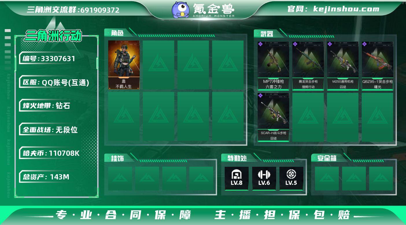 【sjs10795】可二次 跑刀成品号 140m资产110m纯币 特勤体力负重双6 50+aw子弹 sjs10795 143m总资产-110708k哈夫币-60烽火等级-钻石-1战场等级-无军衔 【干员外观】:蛊-不羁人生 【近战皮肤】:近战-黑鹰 【史诗外观】:QBZ95-1突击步枪-曙光,SCAR-H战斗步枪-囚徒,腾龙突击步枪-猎鳄行动,MP7冲锋枪-六套之力,M250通用机枪-囚徒,QJB201轻机枪-炽焰 【稀有外观】:AKM突击步枪-肃杀,SG552突击步枪-贴花艺术, AK-12突击步枪-马年新春,腾龙突击步枪-冰天雪地,K437突击步枪-生存指令,MK47突击步枪-精英联盟,MK47突击步枪-冰河潜伏者,MP5冲锋枪-弄臣,MP5冲锋枪-哈夫克卫队,SMG-45冲锋枪-行动开启,M1014霰弹枪-幻影结构,QJB201轻机枪-哈夫克卫队,SKS射手步枪-弄臣,G18-星链科技,G18-哈夫克航天 【普通外观】:SMG-45冲锋枪-斑马,M4A1突击步枪-粉色涂装,M4A1突击步枪-高雅黑,QBZ95-1突击步枪-高雅黑,QBZ95-1突击步枪-海浪,QBZ95-1突击步枪-三角洲力量,QBZ95-1突击步枪-海色,QBZ95-1突击步枪-2026,K416突击步枪-几何迷彩,K416突击步枪-高雅黑,M16A4突击步枪-三角洲力量,M16A4突击步枪-出货,M7战斗步枪-红色涂装,M7战斗步枪-三角洲力量,M7战斗步枪-黑...