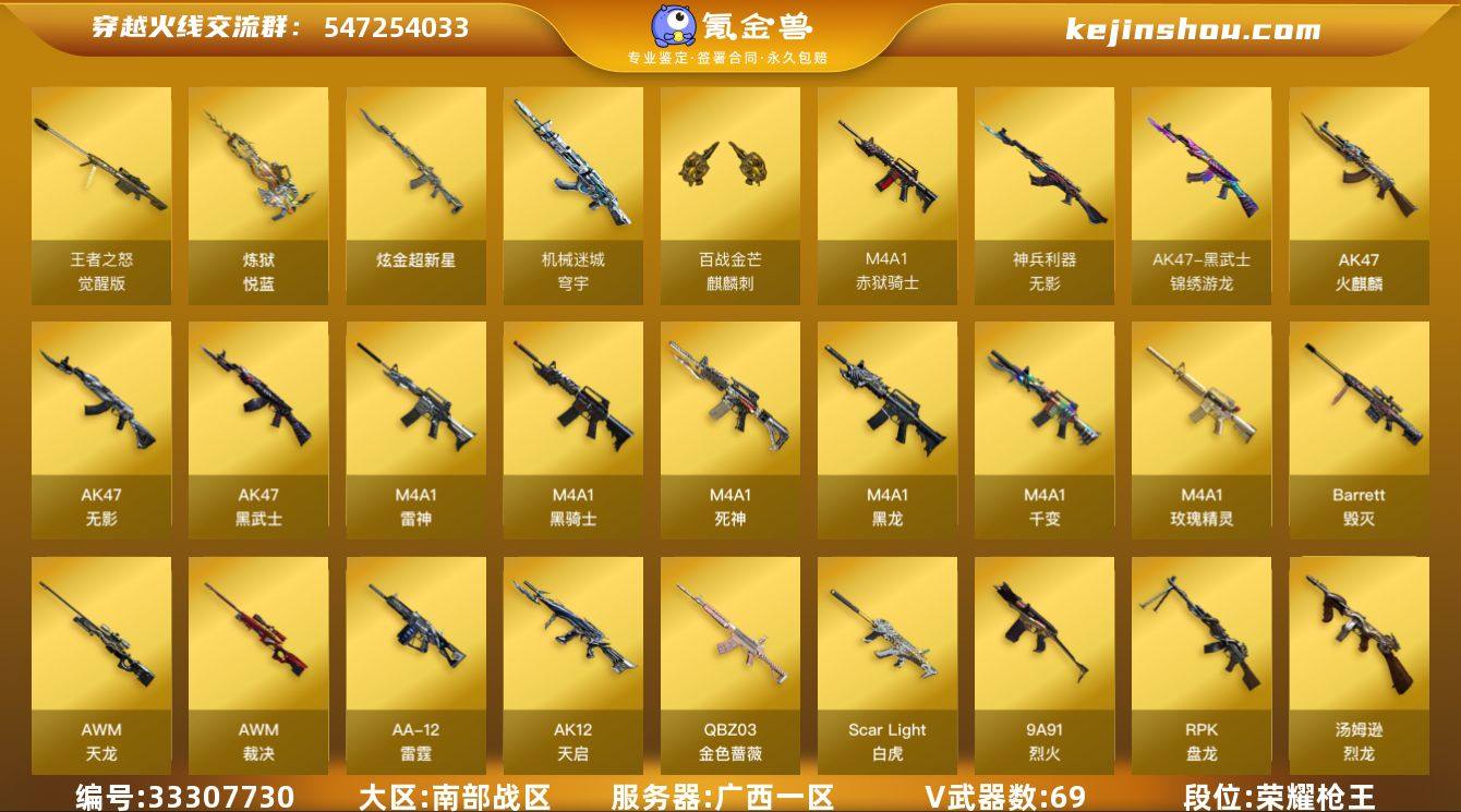 广西一区-72V-2王者武器数-1炫金武器数 【热门武器】:QBZ03-金色蔷薇,Scar Light-白虎,死亡之眼*3,M4A1-黑骑士,汤姆逊-烈龙,RPK-盘龙,加特林-炼狱,裁决-雪莉杨,沙鹰-修罗*2 【王者炫金武器】:炼狱-悦蓝,炫金超新星 【音效卡】:M4A1-黑骑士音效卡,Barrett-毁灭音效卡,Barrett-碧霄极光音效卡*4 【皮肤】:白虎-大汉风骨,雷神-暗月,雷神-能量核心,雷神-虎将,雷神-机甲刑天皮肤,雷神-宇航兔皮肤,M4A1-再燃火线,火麒麟-雷神,AK47-火麒麟-传奇EVEN,火麒麟-心动糖果,毁灭-神秘黑洞皮肤,黑龙-能量核心,黑龙-暗月,黑骑士-冠军之势,死神-秘银,战神-粉色甜心皮肤,战神-紫绶金章皮肤,战神-流金岁月皮肤,天龙-秘银,修罗-能量核心*2,天神-暗月*3,屠龙-荣耀之锋,轻型军用手斧-再燃火线 【角色】:零,葵,零·纪元,乔伊教练,葵-阿尔法武装,空,初恋灵狐,电竞少女,芳心审判者,嘉年华灵狐,灵狐者-X,龙儿-小淘气,麻雀,曼陀罗-礼服,潜龙队-X,青霞仙子,斯沃特-X,蜀雪,兔囡囡,雪莉杨,樱-战斗天使,影武者-X,潘多拉-N 【人偶武器】:裁决-雪莉杨,AWM-灵狐-15周年嘉年华,闪光弹-小乔,灵狐娃娃手雷 【暴走生化】:死亡之眼*3 【挑战大师】:...