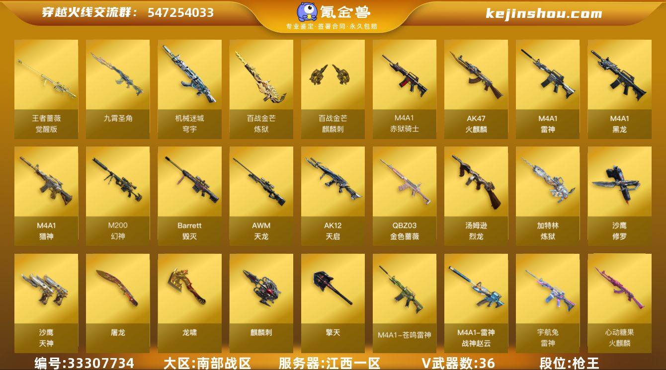 江西一区-41V-4王者武器数-0炫金武器数 【热门武器】:QBZ03-金色蔷薇,M200-幻神,汤姆逊-烈龙*4,加特林-炼狱,斯泰尔-蝴蝶,沙鹰-修罗 【音效卡】:屠龙-电竞之星-竞星跃动音效卡,HK417-朱雀-电竞之星-竞星跃动音效卡,炼狱-百战金芒-庆典舞曲音效卡 【皮肤】:M200-幻神-黄忠皮肤,M4A1-战神赵云,雷神-宇航兔皮肤,M4A1-再燃火线,雷神-课桌奇兵 皮肤,炼狱-玩具枪皮肤,火麒麟-平天大圣,火麒麟-盘古,火麒麟-心动糖果,毁灭-暗月,毁灭-黑大圣皮肤,毁灭-英雄计划 皮肤,屠龙-春桃 皮肤,屠龙-惊鸿 皮肤,轻型军用手斧-再燃火线 【角色】:葵,零·纪元,不败狙神,雪域霜狐,葵-阿尔法武装,幻面灵狐,初恋灵狐,风暴女,兰妹妹,灵狐者-X,灵狐者-七夕宝贝,龙儿-小淘气,潘多拉-甜心教官,青霞仙子,蛇姬,斯沃特-X,兔囡囡,影武者-X 【人偶武器】:斯泰尔-蝴蝶,迷你深渊冰龙,夺魂,生化手雷-机甲核心 【暴走生化】:超级对讲机 【挑战大师】:冰龙粉碎者-白马银枪,激光毁灭者III,神圣爆裂者-末日III 【英雄级武器】:AK47-火麒麟*2,M4A1-黑龙,M4A1-雷神,AK12-天启,QBZ03-金色蔷薇,九霄圣角,M4A1-猎神,HK417-朱雀-电竞之星,机械迷城-穹宇,AWM-天龙,B...