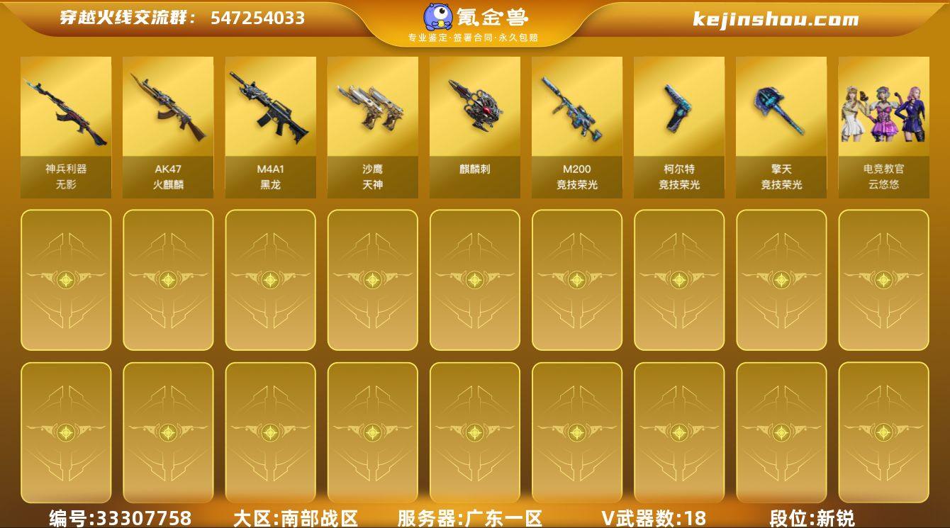 广东一区-19V-0王者武器数-0炫金武器数 【热门武器】:M200-竞技荣光,裁决-雪莉杨 【角色】:电竞教官-云悠悠,蛇隐宗,风暴女,嘉年华灵狐,曼陀罗-X,蛇姬,斯沃特-X 【人偶武器】:裁决-雪莉杨,AWM-灵狐-15周年嘉年华,生化手雷-机甲核心*2 【挑战大师】:神圣爆裂者-末日III 【英雄级武器】:AK47-火麒麟,M4A1-黑龙*2,无影-神兵利器,M200-竞技荣光,沙鹰-天神,柯尔特-竞技荣光,麒麟刺,擎天-竞技荣光,高爆手雷-竞技荣光*2,高爆手雷-古蛇迷踪,闪光弹-雷霆,闪光弹-竞技荣光*2,烟雾弹-竞技荣光*4,烟雾弹-古蛇迷踪 【其他武器】:源·火麒麟,魂·M4A1-雷神-化蛇,魂·雷神-维纳斯,魂-雷神-萌杀,魂·雷神-15周年嘉年华,魂·黑骑士-幻能朋克,御·黑骑士-冰魄,御·黑骑士·哪吒闹海*2,灵·黑骑士-破界 I,魂-死神-机甲核心,御·超新星-圣诞*2,源·武圣,源·机械迷城,魂·HK417-朱雀-凤灵,魂·QBZ03-金色蔷薇-蛇姬,QBZ03-文殊坊,源·天龙,魂·裁决-凤灵,魂·裁决-新人王绿豆,魂·裁决-羽掣,魂·毁灭-秦师,魂·毁灭-神秘黑洞,魂·Barrett-金色蔷薇-蛇姬,魂·Barrett-朱雀- 新春神龙,源·Barrett-朱雀,灵·Barrett-朱雀-炫光,魂·炼狱-玩具枪*2,魂·炼狱-月,魂·修罗-15...