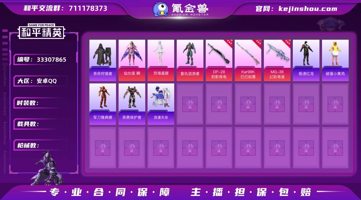 DSH2110【身法号 4特 4粉奇异狩猎者,浪漫天命】安卓Q-3稀有4粉装4特效枪4热门75套装107枪皮 32144热力值 4印记 历史传奇王牌17星 【3稀有】 奇异狩猎者 AKM-缤纷海域 浪漫天命 【4粉装】 仙女座瞬 荧海星豚 异瞳寒姬 复仇流浪者 【4特效枪】 Kar98K-巳巳如意 (4级) MG-36-幻彩电音 (6级) DP-28-豹影疾电 (5级) 蜜獾-异瞳寒姬 (5级) 【4热门】 破蛋小黄鸡 极速红龙 军刀雅典娜 英勇保护者 【2飞行器】 梦幻火箭飞行器 闪光银龙飞行器 【1头盔】 深海小丑鱼头盔 【1背包】 幻影战神背包 营地ID:917494403