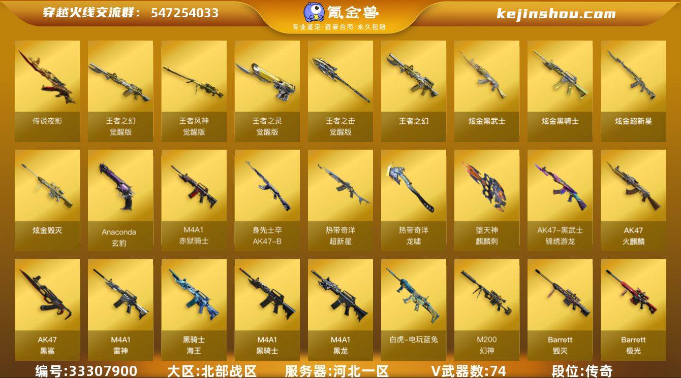 河北一区-80V-6王者武器数-4炫金武器数 【传说武器】:传说夜影 【传说角色】:传说星骇 【热门武器】:传说夜影,G36C-幻影,QBZ03-金色蔷薇,M200-幻神,M200-竞技荣光,死亡之眼,白虎-电玩蓝兔,Kar98K-星神,毒蜂,M4A1-黑骑士,汤姆逊-烈龙*6,RPK-盘龙*6,加特林-炼狱*2,斯泰尔-蝴蝶,玄武-枪娘火莲,USP-雷暴,沙鹰-修罗,炽芒蝶刃 【王者炫金武器】:王者之幻,王者冰锋,炫金骑士,炫金武士,炫金超新星,炫金毁灭 【音效卡】:Kar98K-星神音效卡,M200-幻神音效卡,AK47-火麒麟音效卡,M4A1-雷神音效卡,M4A1-黑骑士音效卡,Barrett-毁灭音效卡,Barrett-极光音效卡,QBZ03-金色蔷薇音效卡,AWM-裁决音效卡,枪娘语音包-阿敏,枪娘语音包-凯萨林 【皮肤】:M200-幻神-黄忠皮肤,幻神-冠军之幻,星神-璀璨皮肤,星神-枪娘默 皮肤,裁决-流光秘银,雷神-暗月,M4A1-战神赵云,雷神-R.LGD-CFPLS18冠军,火麒麟-雷神,火麒麟-战神关羽,火麒麟-平天大圣,火麒麟-心动糖果,毁灭-星空,毁灭-战神张飞,毁灭-黑大圣皮肤,黑龙-暗月,黑骑士-电玩青兔皮肤,战神-粉色甜心皮肤,战神-紫绶金章皮肤*2,战神-流金岁月皮肤,AK47-B-常胜将军-曹操*2,AK47-B-常胜将军-刘备*2...