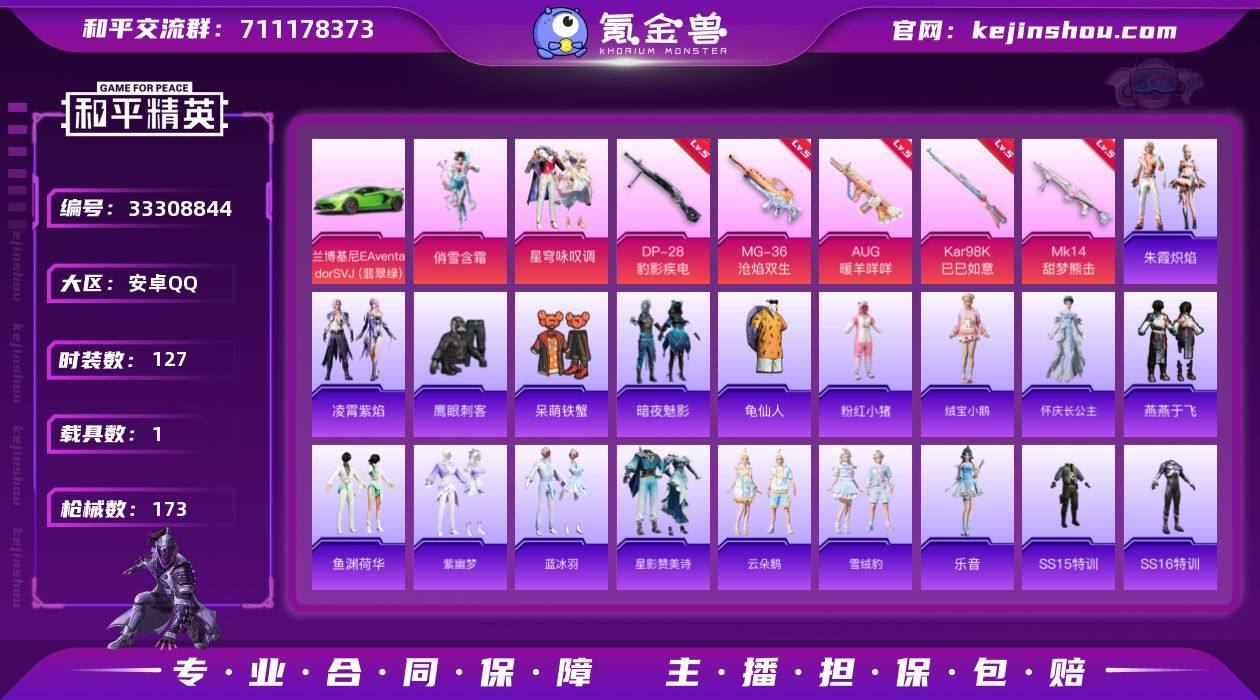 【AYH813】粉装2/粉枪6/载具1/套装127/枪皮173/热力值48916/历史最高段位:王牌印记7次/Lv:62/五级AUG-暖羊咩咩/五级Kar98K-巳巳如意/五级MK14-甜梦熊击/一级Mk14-福马献瑞/五级DP-28-豹影疾电/五级MG-36-沧焰双生/龟仙人/粉红小猪/俏雪含霜/星穹咏叹调/兰博基尼Aventador SVJ(翡翠绿)/AUG-暖羊咩咩/Kar98K-巳巳如意/MK14-甜梦熊击/Mk14-福马献瑞/DP-28-豹影疾电/MG-36-沧焰双生/海渊国主降落伞/恐龙拽拽降落伞/守护天翼降落伞/千金淑猫降落伞/星穹咏叹调降落伞/喜羊羊与灰太狼降落伞/绒宝小鹅/套装-马上有钱/怀庆长公主/燕燕于飞/鱼渊荷华/紫幽梦/蓝冰羽/星影赞美诗/云朵鹅/雪绒豹/乐音/朱霞炽焰/凌霄紫焰/AKM-奇异狩猎者/AKM-彩虹符号/AKM-灼热熔岩/AKM-生命誓言/AKM-破晓战魂/AKM-萌趣颜团子/AKM-虎虎生威/AKM-龙的传人/AKM-玄冥寒域/M16A4-幻世战舞者/M16A4-甜心亚梦/M16A4-红色方程式/M16A4-蓝色火焰/SCAR-L-炫彩节奏/SCAR-L-玉兔迎春/SCAR-L-红色方程式/SCAR-L-龙宫之主/M416-糯团青竹/M416-红色方程式/M416-绯红前夜/M416-蓝色火焰/GROZA-彩虹符号/GROZA-恐龙拽拽/AUG-天降萌叽/AUG-耀粉歌者/AUG-青春冒险家/QBZ-彩虹符号/QBZ-未来歌姬/QBZ-洛神天依/QBZ-飞驰魅影/M762-...