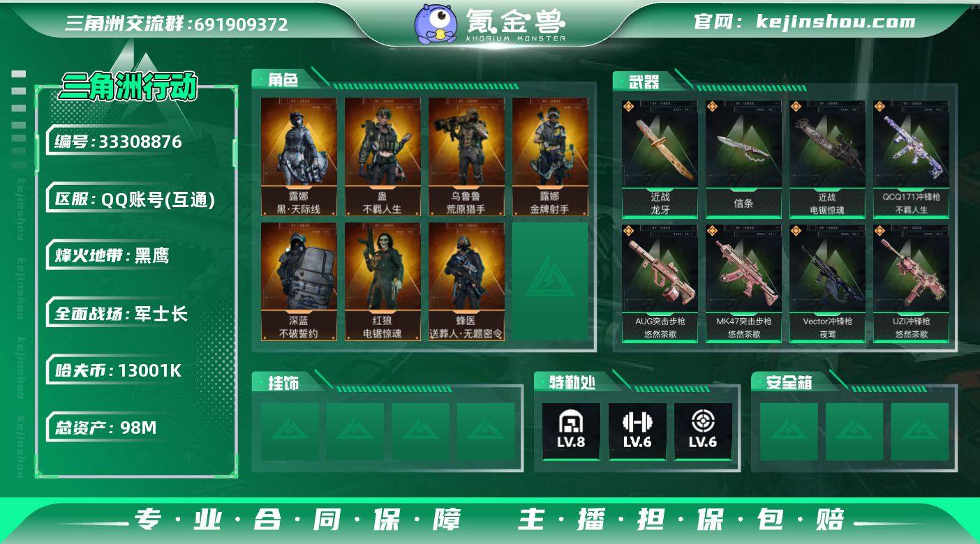 【955796】98m总资产-13001k哈夫币-60烽火等级-黑鹰-20战场等级-军士长 【干员外观】:露娜-黑·天际线,蜂医-送葬人·无题密令,深蓝-不破誓约,红狼-电锯惊魂,露娜-金牌射手,乌鲁鲁-荒原猎手,蛊-不羁人生 【近战皮肤】:近战-信条,近战-龙牙,近战-电锯惊魂,近战-黑鹰 【传说外观】:M4A1突击步枪-阿米娅,ASh-12战斗步枪-鹅鸭杀,K416突击步枪-行动记录,AUG突击步枪-悠然茶歇,SG552突击步枪-运动员,AK-12突击步枪-特斯拉线圈,SCAR-H战斗步枪-启航,G3战斗步枪-骑士,CAR-15突击步枪-阿米娅,腾龙突击步枪-捞点薯条,KC17突击步枪-电锯惊魂,MK47突击步枪-悠然茶歇,MK47突击步枪-暗星,P90冲锋枪-信条,Vector冲锋枪-夜莺,UZI冲锋枪-特斯拉线圈,UZI冲锋枪-悠然茶歇,SR-3M紧凑突击步枪-特斯拉线圈,勇士冲锋枪-能天使-午夜邮差,QCQ171冲锋枪-鹅鸭杀,QCQ171冲锋枪-不羁人生,MK4冲锋枪-夜莺,S12K霰弹枪-电锯惊魂,725双管霰弹枪-送葬人-无题密令,M250通用机枪-骑士之心,QJB201轻机枪-鹅鸭杀,Mini-14射手步枪-夜莺,M14射手步枪-电锯惊魂,M14射手步枪-蛮荒,M14射手步枪-缄花,SR-25射手步枪-信条,SR-25射手步枪-缄花,AWM狙击步枪-捞点薯条,.357左轮-缄花...