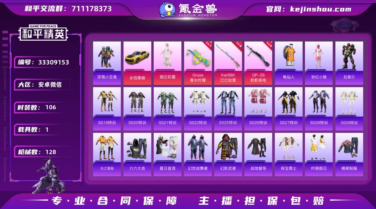 【有社交限制 不影响游戏正常使用 】时装数: 425 载具数: 1 枪械数: 128 战备数: 102 热门装扮: 深海小丑鱼,烟云彩露,辉云木星 载具: 永恒黄蜂 稀有枪皮: GROZA-香水柠檬(七级),Kar98K-巳巳如意(五级),Mk14-福马献瑞(五级),DP-28-豹影疾电(四级)