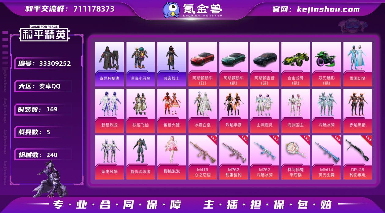 【钱包无法注销,不影响账号安全和游戏正常】时装数: 607 载具数: 5 枪械数: 240 战备数: 172 热门装扮: 奇异狩猎者,深海小丑鱼,梦魇先生,鹰眼刺客,锦绣火鲤,冰霜白皇,新星烈龙,扶摇飞仙,雪国幻梦,山涧鹿灵,烈焰拳霸,海渊国主,紫电风暴,赤焰黑爵,冷魅冰骑,复仇流浪者,浪客战士,银碳小老虎,暗夜魅影,樱桃泡泡 载具: 双人摩托-双刃魅影(绿),阿斯顿·马丁DBS(红),阿斯顿·马丁DBS(绿),阿斯顿·马丁DBX(蓝),合金龙骨(绿) 稀有枪皮: M416-心之恋语(七级),AUG-罪夜之冕(七级),M762-甜蜜誓约(七级),M762-冷魅冰骑(七级),AKS-74U-星穹咏叹调(五级),Kar98K-伏魔团(四级),Kar98K-巳巳如意(四级),AWM-橘柚倾心(五级),Mini14-荧光虫舞(六级),Mk14-福马献瑞(三级),DP-28-豹影疾电(五级),平底锅-林间仙鹿(七级)