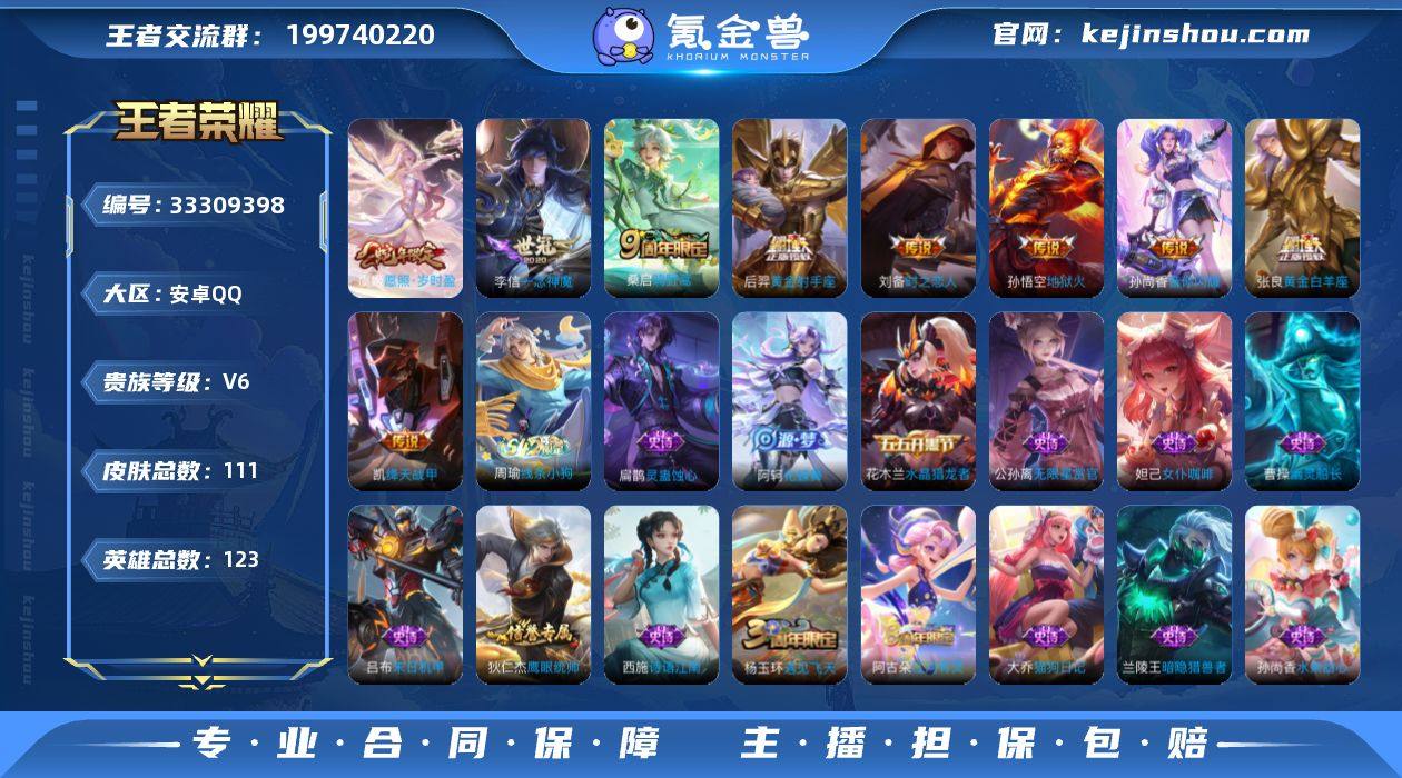 实名: 可修改 性别: 男号 贵族等级: V6 英雄数: 123 皮肤数: 111 传说皮: 黄金射手座,绛天战甲,黄金白羊座,一念神魔,地狱火,时之恋人-刘备,音你闪耀 限定皮: 遇见飞天,鸣野蒿,愿照·岁时盈