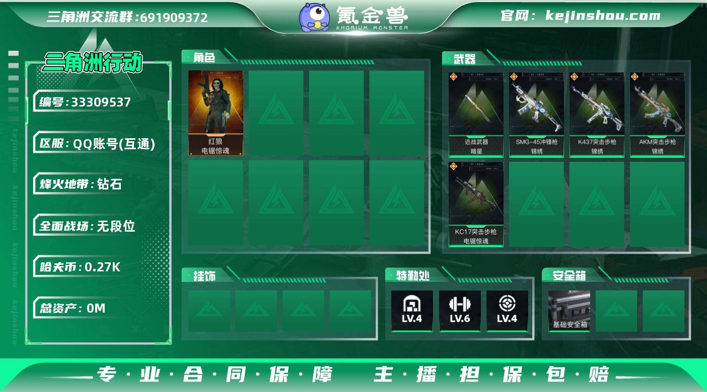 实名: 可修改 烽火地带段位: 钻石 全面战场段位: 无段位 总资产: 31 哈夫币: 270 干员外观: 红狼-电锯惊魂 传说武器皮肤: KC17突击步枪-电锯惊魂,近战-暗星,SMG-45冲锋枪-锦绣,K437突击步枪-锦绣,AKM突击步枪-锦绣