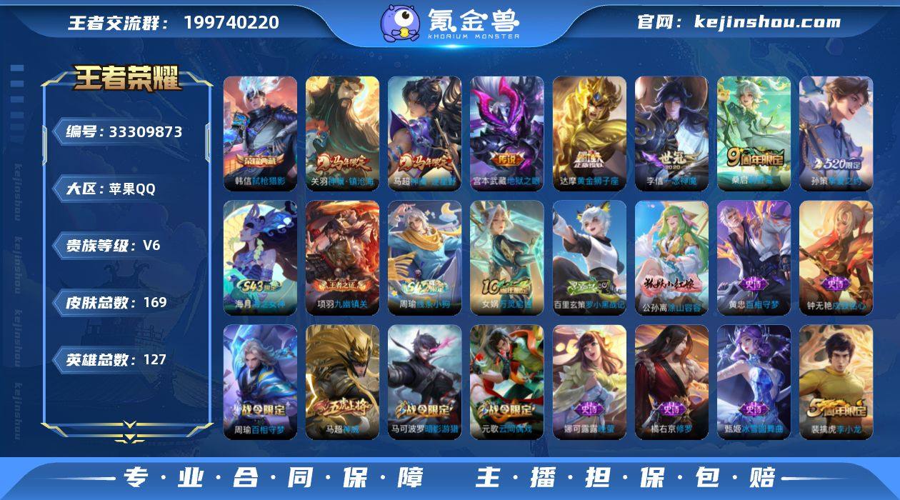 苹果Q-V6-永恒钻石III段位-127英雄-169皮肤-1典藏皮肤-7传说-49史诗 【荣耀典藏】:韩信弑枪猎影 【传说皮肤】:关羽神骥镇沧海,马超神骥逐星野,桑启鸣野蒿,孙策挚爱之约,李信一念神魔,达摩黄金狮子座,宫本武藏地狱之眼 【限定皮肤】:狄仁杰阴阳师,赵云皇家上将,墨子神迹守卫,孙尚香蔷薇恋人,元歌云间偶戏,元歌无心,马可波罗暗影游猎,狄仁杰魔术师,狄仁杰万华元夜,达摩沙漠行僧,项羽海滩派对,老夫子醍醐杖,老夫子航海奇遇记,程咬金演武夺筹,兰陵王金庭之子,亚瑟潮玩骑士王,后羿圣弓游侠,钟馗驱傩正仪,蔡文姬繁星吟游,鬼谷子原初探秘者,苏烈千军破阵,弈星混沌棋,沈梦溪大漠名商,明世隐疑决卦,裴擒虎李小龙,云中君纤云弄巧,孙策挚爱之约,猪八戒西部大镖客,上官婉儿梁祝,蒙犽百解令,鬼谷子天穹祈灯,沈梦溪龙舞盛年 【赛季限定】:弈星混沌棋,明世隐疑决卦,老夫子醍醐杖,鬼谷子原初探秘者,狄仁杰万华元夜,程咬金演武夺筹,钟馗驱傩正仪,苏烈千军破阵,达摩沙漠行僧,兰陵王金庭之子,沈梦溪大漠名商,鬼谷子天穹祈灯,东皇太一噬灭天穹,钟馗虚灵犬护,甄姬逆浪荇歌,亚瑟荣光之誓,项羽九幽镇关 【战令限定】:马可波罗暗影游猎,猪...