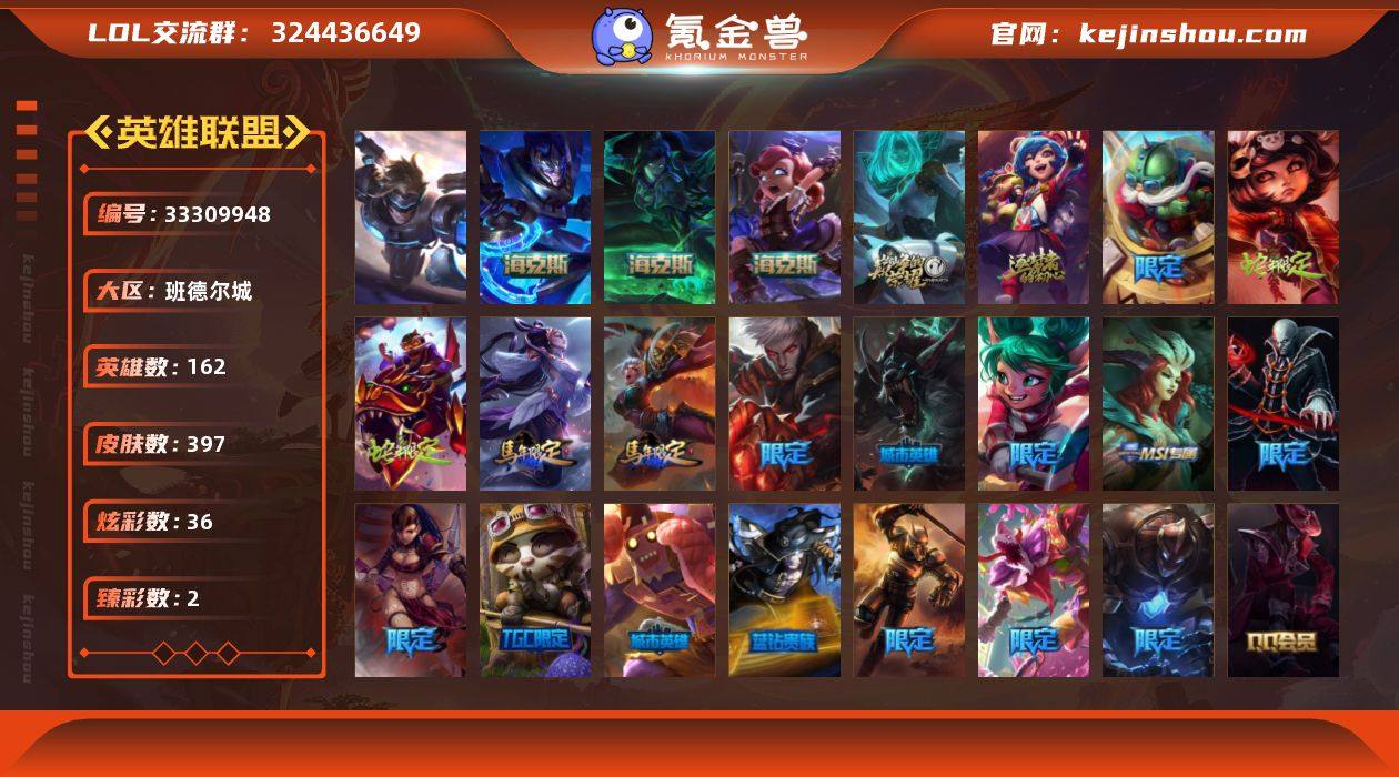 【皇冠号】未定级段位-162英雄-397皮肤-36炫彩-1终极-6神话-83限定-38传说-120史诗 【珍稀头像】:星守阿狸头像 【神话皮肤】:十周年纪念安妮,源代码乐芙兰,神凰行者瑞羽圣凰艾尼维亚 【海克斯皮肤】:海克斯科技安妮,海克斯科技嘉文四世,摄魂使者薇恩 【臻彩皮肤】:霸天巨兽雪崩墨菲特,红莲之刃锐雯 【年限皮肤】:你看见过我的熊猫吗安妮,碧玉之牙卡西奥佩娅,神龙之翼库奇,替父从军花木兰,广寒仙子嫦娥 【情人节限定】:觅心女王艾希 【冰雪限定】:幸福女神乐芙兰,圣诞开心鬼提莫,圣诞精灵崔丝塔娜,圣诞狂欢努努和威朗普,圣诞糖果棒厄运小姐,圣诞狂欢基兰,阿木木“主人不要我了”,胡桃夹子萨科,平安夜女神娑娜,英勇玩具兵普朗克,邪恶圣诞老人维迦,喜庆之树茂凯,雪默丁格,圣诞玩偶波比,圣诞老人古拉加斯,圣诞驯鹿克格莫,魄罗骑士瑟庄妮,圣诞老人布隆,冰雪节辛吉德,冰雪节格雷福斯,冰雪兽纳尔 【终极皮肤】:未来战士伊泽瑞尔 【限定皮肤】:钢铁军团拉克丝,卧虎藏龙贾克斯,舞会公主安妮,诺斯费拉图弗拉基米尔,冠军典狱长锤石,冠军之血希瓦娜,冠军之矛卡莉丝塔,冠军之刃锐雯2016,冠军之隐劫,Fnatic古拉加斯,Fnatic迦娜,Fnatic嘉文四...