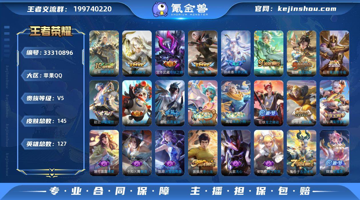 苹果Q-V5-最强王者段位-127英雄-145皮肤-11传说-45史诗 【传说皮肤】:后羿神树通天,桑启鸣野蒿,孙尚香异界灵契,貂蝉遇见胡旋,赵云淬星耀世,镜炽阳神光,曜云鹰飞将,虞姬云霓雀翎,梦奇胖达荣荣,后羿黄金射手座,宫本武藏地狱之眼 【限定皮肤】:姜子牙天穹之誓,狄仁杰阴阳师,赵云皇家上将,墨子神迹守卫,孙尚香异界灵契,庄周高山流水,高渐离玩趣恶龙,元歌无心,狄仁杰魔术师,达摩沙漠行僧,项羽海滩派对,老夫子航海奇遇记,貂蝉遇见胡旋,程咬金演武夺筹,兰陵王金庭之子,孙悟空孙行者,后羿圣弓游侠,李元芳云中旅人,钟馗驱傩正仪,干将莫邪真爱魔法,雅典娜黎明之约,鬼谷子五谷丰年,苏烈千军破阵,百里玄策原初追逐者,梦奇顽趣,沈梦溪大漠名商,裴擒虎李小龙,裴擒虎擒涛扼浪,云中君纤云弄巧,嫦娥拒霜思,鲁班大师探海日志,桑启海盐诗旅,鬼谷子天穹祈灯,姬小满妄想食味,沈梦溪龙舞盛年 【赛季限定】:程咬金演武夺筹,钟馗驱傩正仪,苏烈千军破阵,达摩沙漠行僧,兰陵王金庭之子,沈梦溪大漠名商,李元芳云中旅人,桑启海盐诗旅,裴擒虎擒涛扼浪,鲁班大师探海日志,鬼谷子天穹祈灯,姜子牙天穹之誓,东皇太一噬灭天穹,亚瑟荣光之誓,百里玄策...