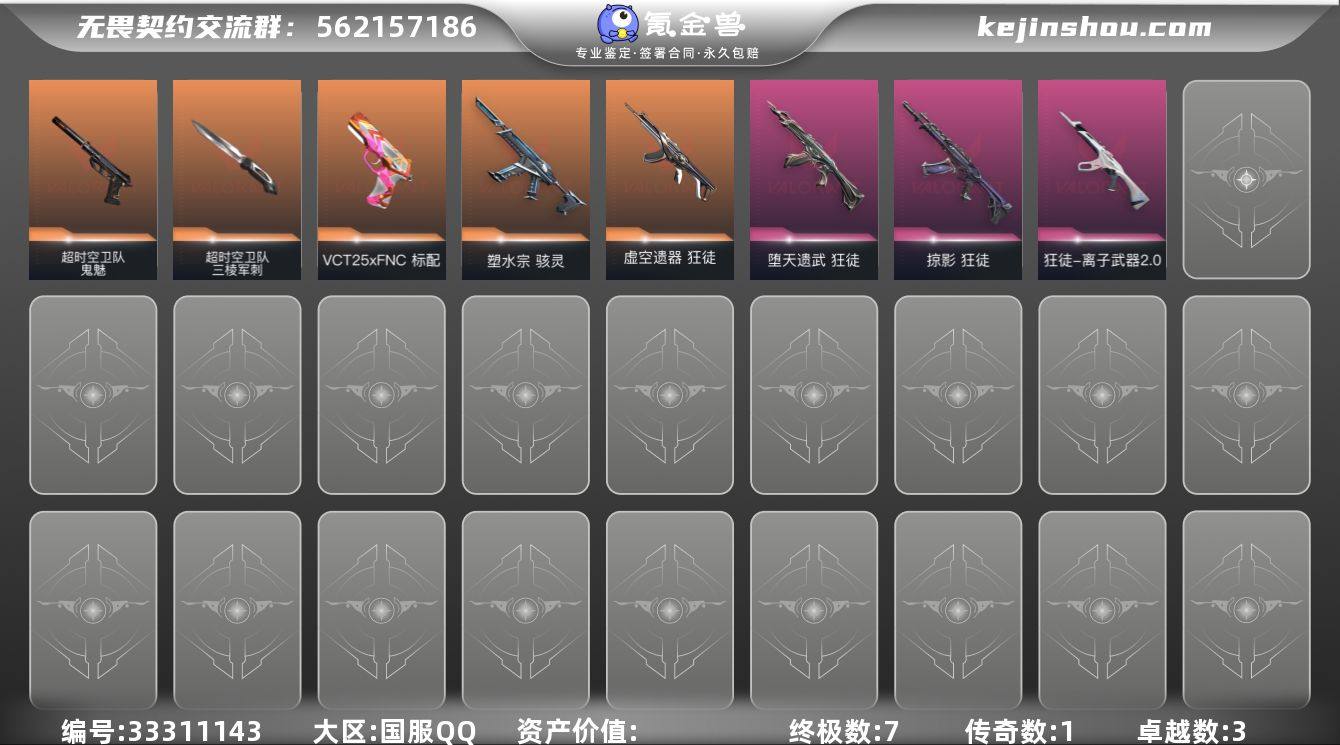 【2.1W库存.黑波.三棱军刺.塑水宗.虚空.弃王.掠夺.】【英雄】:炼狱,维斯,暮蝶,铁臂,捷风,幽影,不死鸟,贤者,猎枭,蝰蛇,零,芮娜,奇乐,尚勃勒,夜露,星礈,海神,黑梦,钢锁 【近战武器】:近战武器-碎心裂刃,近战武器-超时空卫队 三棱军刺,近战武器-黑波之刃,近战武器-未来开拓者 【狂徒】:狂徒-虚空遗器,狂徒-堕天遗武,狂徒-掠影,狂徒-离子武器//2.0 【骇灵】:骇灵-塑水宗 【VCT手枪】:标配-VCT25 x FNC 【鬼魅】:鬼魅-超时空卫队 【卡面】:南瓜盛典 卡面,正义的化身 卡面,霓帧牛蛙 卡面,梦幻奶茶 卡面,无畏契约GO!第一卷:芮娜 卡面,清除名单 卡面,无畏契约GO!第一卷:零 卡面,钢锁vs盖可 卡面,铁臂设计图 卡面,代号红色 卡面,新兵报到 卡面,V契约 卡面,无畏契约 卡面 【喷漆】:捷风差距 喷漆,买装还是存钱 喷漆,无畏契约GO!第一卷:零 喷漆,暴走萝莉 喷漆,胜利属于无畏契约 喷漆,GLHF 喷漆,无畏契约 喷漆 【挂饰】:第九季//第三幕 纪念币 挂饰,无畏契约GO!第一卷 芮娜 挂饰,无畏契约GO!第一卷 零 挂饰,薰衣草之心 挂饰,袖珍捷风 挂饰,第九季//第一幕 纪念币 挂饰,天外飞客 挂饰,第七季//第三幕 纪念币 挂饰,无畏...