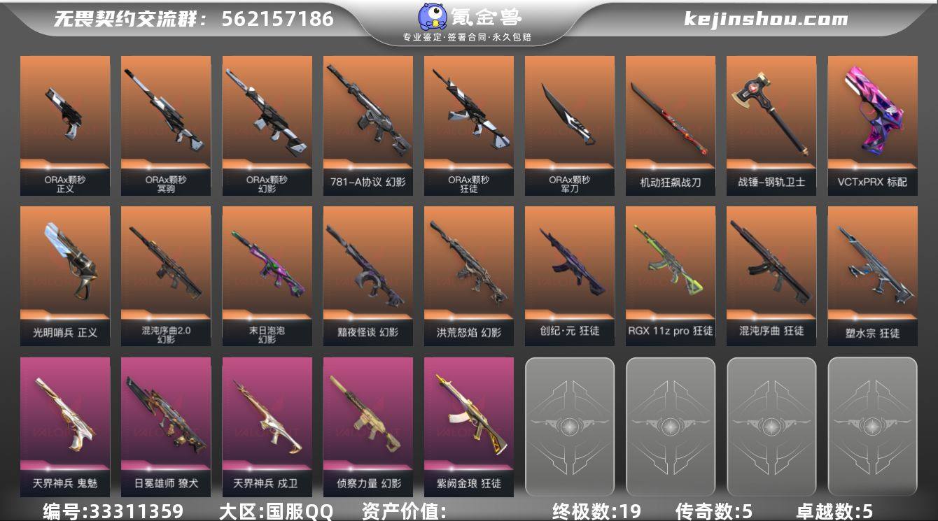 【5w库存颗秒套.紫金爪.剥皮小刀.摩托直刀.掠夺爪.六狂徒七幻影塑水宗.混沌.显卡.古神.末日泡泡.781协议.侦查】YXy6491【无二次】【因赛季更新游戏段付以上号为准!】 【套装】:ORA x 颗秒套装 【英雄】:幻棱,炼狱,维斯,暮蝶,钛狐,壹决,铁臂,捷风,雷兹,幽影,不死鸟,贤者,猎枭,蝰蛇,零,芮娜,奇乐,尚勃勒,霓虹,斯凯,夜露,星礈,K/O,海神,盖可,黑梦,钢锁 【近战武器】:近战武器-碎心裂刃,近战武器-ORA x 颗秒 军刀,近战武器-影钩,近战武器-剥皮小刀,近战武器-紫金爪刀,近战武器-未来开拓者,近战武器-埃芒迪尔大剑,近战武器-钢轨卫士 战锤,近战武器-机动狂飙 战刀 【狂徒】:狂徒-混沌序曲,狂徒-塑水宗,狂徒-创·纪元,狂徒-RGX 11z Pro,狂徒-ORA x 颗秒,狂徒-紫阙金琅,狂徒-钢轨卫士 【幻影】:幻影-黯夜怪谈,幻影-洪荒怒焰,幻影-末日泡泡,幻影-混沌序曲//2.0,幻影-ORA x 颗秒,幻影-781-A协议,幻影-侦察力量,幻影-战术小伙伴 【戍卫】:戍卫-天界神兵,戍卫-钢轨卫士 【獠犬】:獠犬-日冕雄师,獠犬-战术小伙伴 【冥驹】:冥驹-ORA x 颗秒 【飞将】:飞将-光导纤维 【奥丁】:奥丁-战术小伙伴 【骇灵】:骇灵-光导纤维 【蜂刺】:...