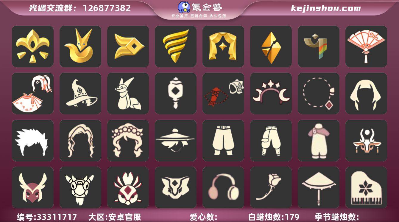 蜡烛数:179/爱心数:18/云野/雨林/霞谷/墓土/禁阁/集结季/小王子季/风行季/潜海季/表演季/破晓季/彩染季/阿努比斯(狗头)/凤凰面具/队长面具/小王子发型/小王子套装/玫瑰花/风行毛领/单边小辫/暗红斗篷/黄眉企鹅面具/燕尾斗篷/冥龙斗篷/留辫蘑菇头/高领舞服/透明蝶翼斗/辉光羚羊面具/彩染围巾斗篷/跃动跑鞋/巫师/鲤鱼套/星月头饰/圣诞鹿角/彩虹耳钉/衔福献瑞礼包/欧若拉之声/灯笼/献瑞折扇礼包/小憩茶桌/小狐狸/冥龙南瓜/武士裤/背带裤/搓澡巾/虚荣/花环/红耳机/若笠/白金斗篷/黑金斗篷/红金斗篷/雨伞/高音钢琴/黄鼠狼/羊头面具/星月头冠/花环长发/帝企鹅发/多羽发饰/贝壳发饰/雪花发夹/创始人斗篷/围巾斗篷/斜边队长斗篷/情人小船/情人秋千/中秋灯笼