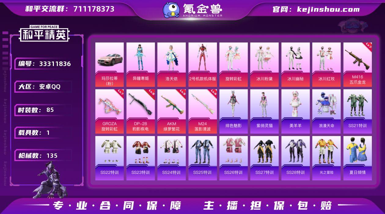 安卓 【精品小号 套装-浪漫天命/角色-洛天依/角色-异瞳寒姬/AKM-绿萝繁花(五级)/M416-五爪金龙(七级)/玛莎拉蒂Ghibli(粉)/银河战甲背包】手Q-7粉装-5特效枪-1载具-2粉色飞行器-43195热力值-6王牌印记-85套装-135枪皮 【热门品类】:套装-浪漫天命 【粉色套装】:角色-洛天依,角色-2号机款机体服,粉装-旋转彩虹,粉装-冰川粉黛,粉装-冰川幽秘,粉装-冰川红玫,角色-异瞳寒姬 【粉色枪皮等级】:AKM-绿萝繁花(五级),M416-五爪金龙(七级),GROZA-旋转彩虹(七级),M24-莲影清波(四级),DP-28-豹影疾电(五级) 【粉色载具】:玛莎拉蒂Ghibli(粉) 【粉色枪皮】:AKM-绿萝繁花,M416-五爪金龙,GROZA-旋转彩虹,M24-莲影清波,DP-28-豹影疾电 【粉色飞行器】:炫彩糖果飞行器,冰川粉黛飞行器 【粉色降落伞】:幻影战神降落伞,洛神天依降落伞,彩虹甜喵降落伞,旋转彩虹降落伞,冰川粉黛降落伞,莲影清波降落伞,异瞳寒姬降落伞,炫彩糖果降落伞 【稀有套装】:套装-炫彩糖果,套装-迅捷龙虾,玩偶服-美羊羊,角色-绯色魅影,角色-紫俏灵猫,套装-雨过天青,套装-红釉青花 【稀有枪皮】:AUG-冰晶雪宝,AKM-墨染幽兰,AKM-影袭,AKM-龙的传人,M16A4-幻世战舞者,SCAR-L-炫彩...