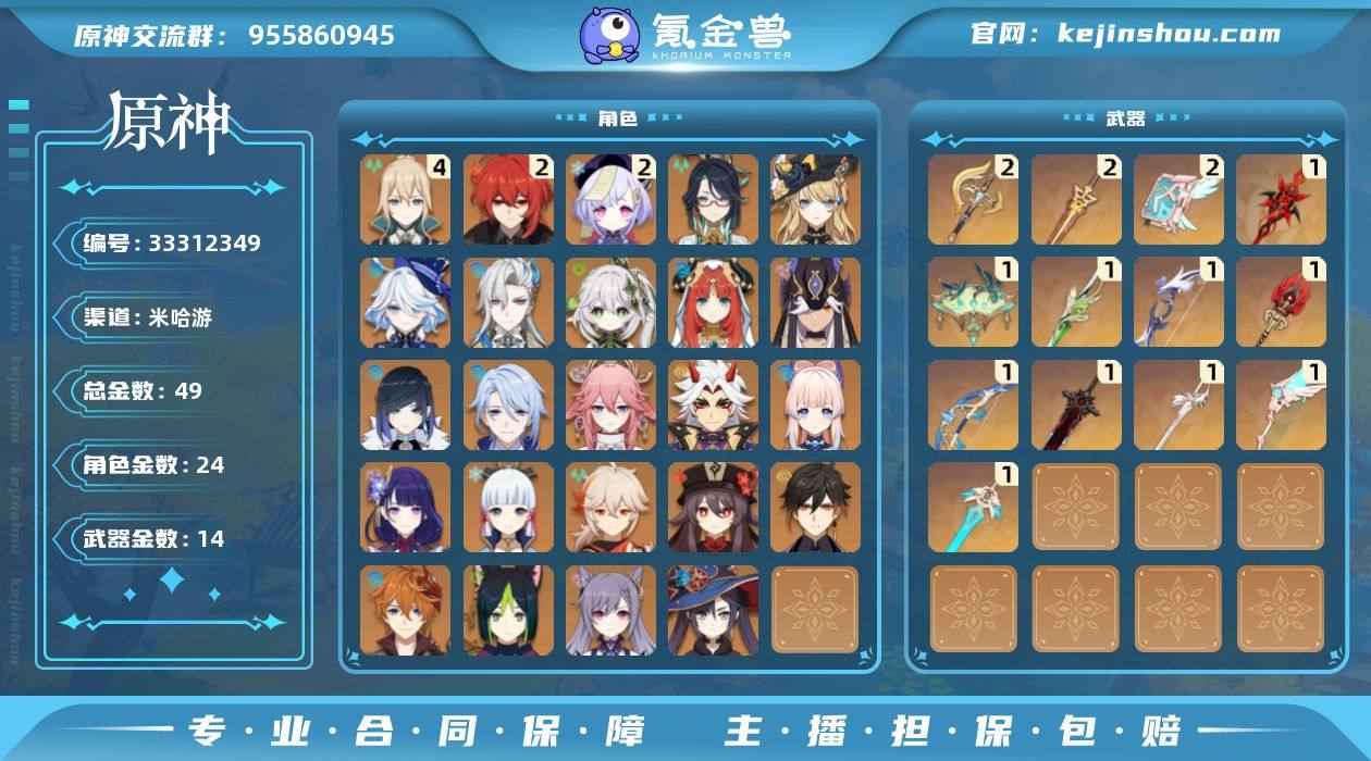 59级/49黄/女主/24个五星角色/14个五星武器 0命闲云,0命娜维娅,0命芙宁娜,0命那维莱特,0命纳西妲,0命妮露,0命赛诺,0命提纳里,0命夜兰,0命神里绫人,0命八重神子,0命荒泷一斗,0命雷电将军,0命枫原万叶,0命神里绫华,0命钟离,0命胡桃,0命达达利亚,0命珊瑚宫心海,0命刻晴,2命七七,4命琴,0命莫娜,2命迪卢克,精1赤月之形,精1鹤鸣余音,精2裁断,精1裁叶萃光,精2圣显之钥,精1若水,精1终末嗟叹之诗,精1护摩之杖,精1天空之翼,精1天空之刃,精2天空之卷,精1风鹰剑,精1狼的末路