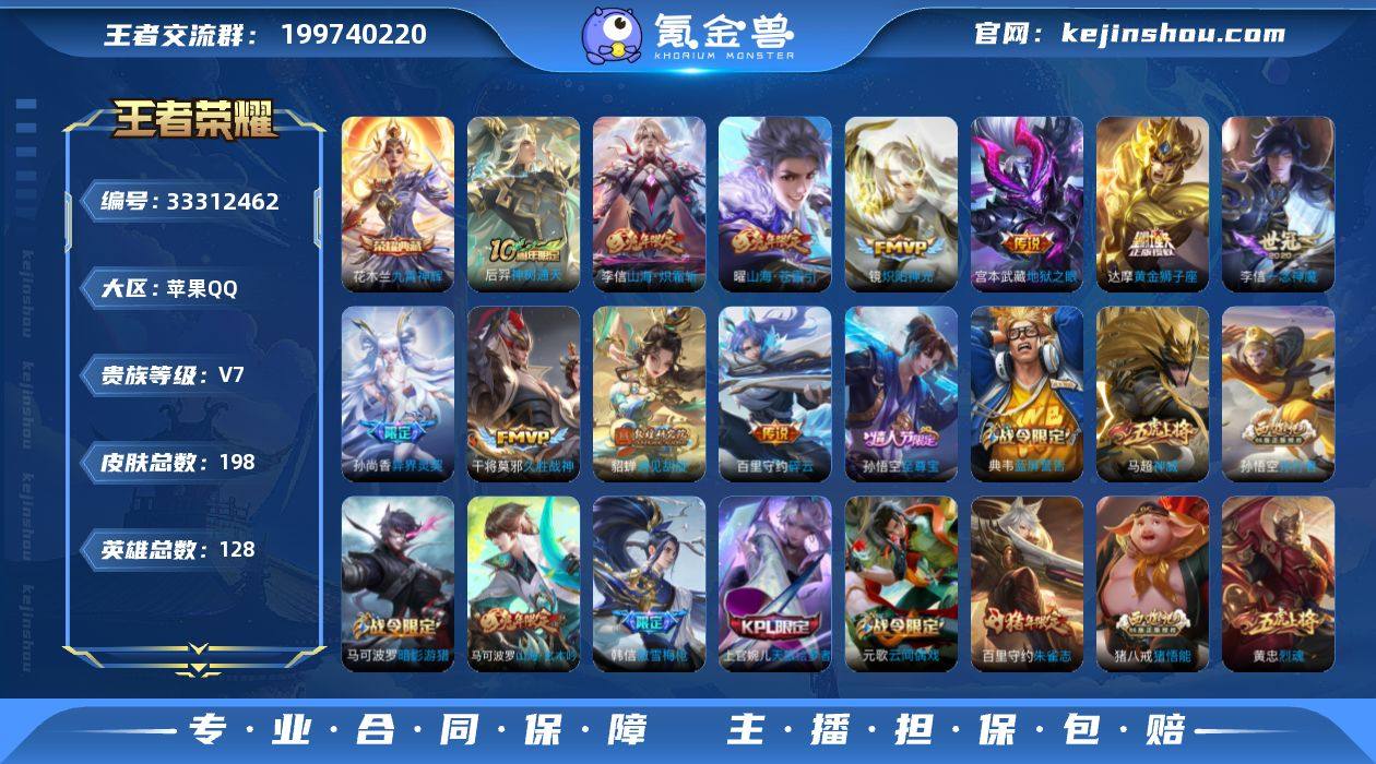 V7 1典藏 12传说 198皮肤 128英雄 【1水晶】花木兰-九霄神辉【12传说】曜-山海·苍雷引,李信-山海·炽霜斩,百里守约-碎云,达摩-黄金狮子座,貂蝉-遇见胡旋,干将莫邪-久胜战神,宫本武藏-地狱之眼,镜-炽阳神光,李信-一念神魔,孙尚香-异界灵契,后羿-神树通天【60史诗】元歌-无心,鬼谷子-五谷丰年,赵云-未来纪元,澜-赏金猎手,阿轲-节奏热浪,阿轲-迷踪丽影,白起-星夜王子,百里守约-朱雀志,不知火舞-魅语,蔡文姬-舞动绿茵,曹操-幽灵船长,嫦娥-拒霜思,程咬金-功夫厨神,妲己-女仆咖啡,妲己-魅力维加斯,狄仁杰-魔术师,狄仁杰-鹰眼统帅,典韦-蓝屏警告,貂蝉-圣诞恋歌,公孙离-无限星赏官,宫本武藏-鬼剑武藏,韩信-白龙吟,韩信-傲雪梅枪,黄忠-烈魂,橘右京-修罗,铠-曙光守护者,兰陵王-暗隐猎兽者,李白-千年之狐,李元芳-逐浪之夏,廉颇-地狱岩魂,露娜-紫霞仙子,吕布-圣诞狂欢,马超-神威,马可波罗-暗影游猎,蒙犽-狂想玩偶喵,墨子-金属风暴,娜可露露-晚萤,上官婉儿-梁祝,裴擒虎-李小龙,上官婉儿-天狼绘梦者,司马懿-暗渊魔法,孙策-猫狗日记,孙尚香-水果甜心,孙尚香-时之恋人,孙悟空-至尊宝,孙悟空-孙行者,王昭君-偶像歌手,夏侯惇-乘风破浪,小乔-缤纷独角兽,雅典娜-冰冠公主,嬴政-优雅恋人,元歌-云间偶...