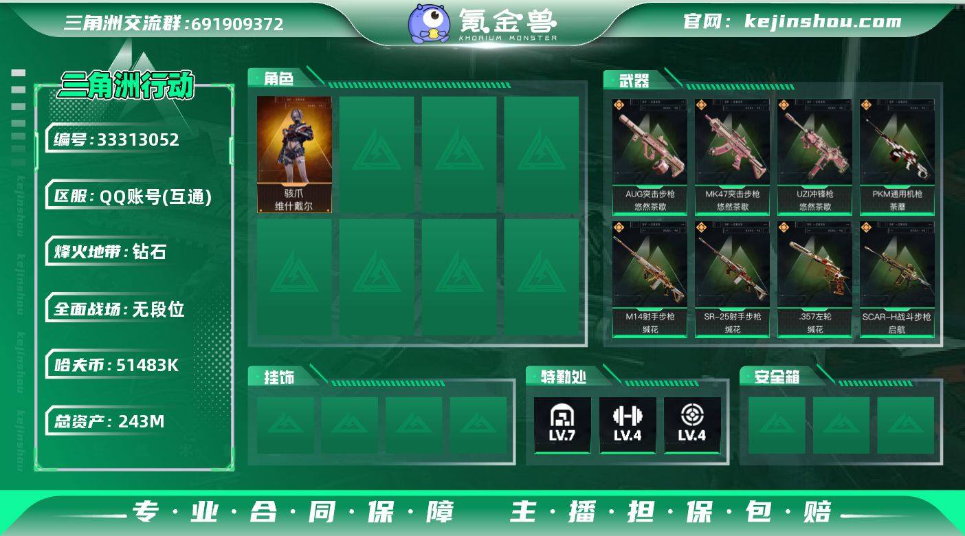 【LSJX318】总资产243M/哈夫币5148万/传说枪皮数9/战场等级1/行动等级60/安全箱等时效性道具以游戏内数据为准,详情请看图/骇爪-维什戴尔/近战-黑鹰/AUG突击步枪-悠然茶歇/SCAR-H战斗步枪-启航/MK47突击步枪-悠然茶歇/UZI冲锋枪-悠然茶歇/PKM通用机枪-荼蘼/M14射手步枪-缄花/SR-25射手步枪-缄花/R93狙击步枪-维什戴尔/.357左轮-缄花/K416突击步枪-冬日风情/AUG突击步枪-蝮蛇/G3战斗步枪-哈夫克警备/MP5冲锋枪-竞技风/MP7冲锋枪-六套之力/QJB201轻机枪-炽焰/M14射手步枪-工业狂潮/SCAR-H战斗步枪-旧梦/SCAR-H战斗步枪-休闲时光/M4A1突击步枪-零点/AKM突击步枪-肃杀/K416突击步枪-碳纤维/K416突击步枪-一帆风顺/M7战斗步枪-捣蛋鬼/SG552突击步枪-2026/SG552突击步枪-贴花艺术/AK-12突击步枪-零点/ AK-12突击步枪-马年新春/K437突击步枪-生存指令/MK47突击步枪-精英联盟/SMG-45冲锋枪-行动开启/勇士冲锋枪-冰天雪地/M1014霰弹枪-幻影结构/M249轻机枪-冰天雪地/Mini-14射手步枪-荣耀列队/SVD狙击步枪-战术行动/SKS射手步枪-弄臣/MP5冲锋枪-古铜/PTR-32突击步枪-噬菌体/VSS射手步枪-噬菌体/M4A1突击步枪-粉色涂装/M4A1突击步枪-高雅黑/M4A1突击步枪-海色/QBZ95-1突击步枪-高雅黑/QB...