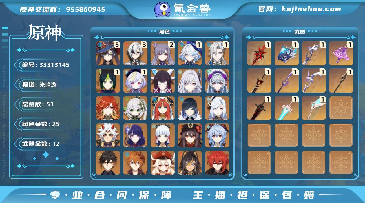 51黄!胡行钟夜!雷国!雷九万班!3+1仆人!1+1龙王!1命芙宁娜!0+1钟离!0+1甘雨!0+1雷电将军!0+1荒泷一斗!0+1夜兰!神里绫华!可莉!达达利亚!胡桃!申鹤!妮露!纳西妲!玛薇卡丝柯克!少女!1精武器: 狼的末路!天空之翼!天空之傲!神乐之真意!