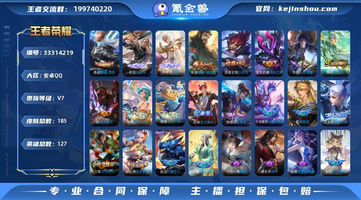 安卓Q-V7-最强王者段位-127英雄-185皮肤-1典藏皮肤-2无双-6传说-43史诗 【英雄全皮】:孙权全皮 【荣耀典藏】:李白鸣剑曳影 【无双皮肤】:李信问心剑,孙悟空无相 【传说皮肤】:关羽神骥镇沧海,桑启鸣野蒿,铠绛天战甲,李信一念神魔,百里玄策白虎志,宫本武藏地狱之眼 【限定皮肤】:白起狰,暃埋骨钱,姜子牙天穹之誓,狄仁杰阴阳师,虞姬凯尔特女王,赵云皇家上将,赵云引擎之心,妲己时之彼端,芈月重明,元歌云间偶戏,夏侯惇朔风刀,曹操烛龙,典韦穷奇,狄仁杰魔术师,狄仁杰万华元夜,达摩星际陆战队,项羽海滩派对,老夫子醍醐杖,程咬金演武夺筹,韩信逐梦之影,花木兰默契交锋,亚瑟潮玩骑士王,孙悟空至尊宝,牛魔御旌,李元芳云中旅人,钟馗驱傩正仪,干将莫邪冰霜恋舞曲,鬼谷子原初探秘者,百里玄策白虎志,弈星混沌棋,明世隐疑决卦,裴擒虎李小龙,裴擒虎擒涛扼浪,狂铁御狮,米莱狄御霄,米莱狄胡桃异想国,云中君纤云弄巧,盾山御銮,上官婉儿梁祝,鲁班大师探海日志,桑启海盐诗旅,张良古海寻踪,鬼谷子天穹祈灯,姬小满妄想食味 【年限皮肤】:百里玄策白虎志 【赛季限定】:虞姬凯尔特女王,白起狰,曹操烛龙,芈月重明,典韦穷奇,狂铁御狮,米...