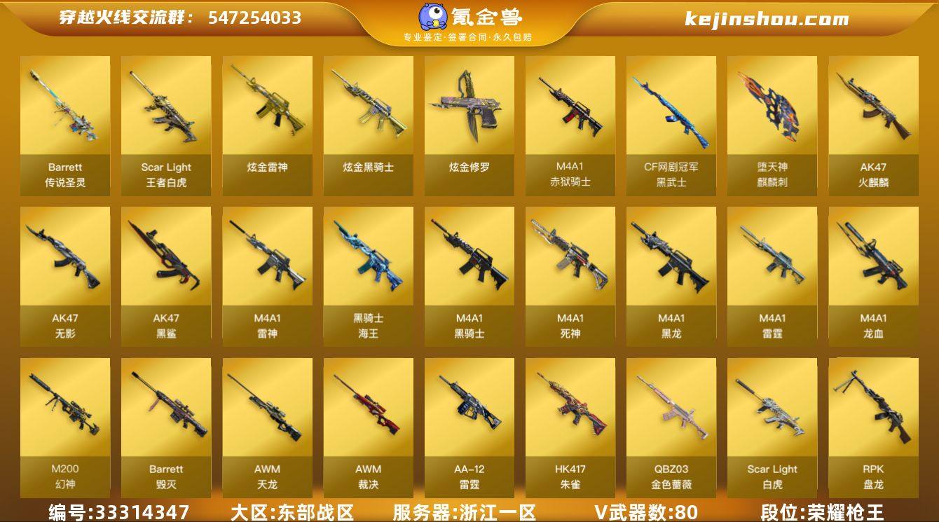 浙江一区-82V-15王者-3炫金【冠军之幻+幻神音效卡❤传说圣灵白虎金色蔷薇❤生化6烈蝴蝶捕食者佣兵觉醒❤冠军套⑱⑳荣耀套世冠套】 【传说武器】:传说圣灵 【热门武器】:传说圣灵,王者白虎,QBZ03-金色蔷薇*3,Scar Light-白虎,HK417-朱雀,M200-幻神*2,死亡之眼,M4A1-黑骑士,汤姆逊-烈龙*5,RPK-盘龙,斯泰尔-蝴蝶,羊驼玩偶,火麒麟-绝迹,COP-白鲨,沙鹰-修罗*5 【王者炫金武器】:炫金骑士,炫金雷神,炫金修罗,王者白虎 【音效卡】:M200-幻神音效卡,M4A1-黑骑士音效卡,Barrett-毁灭音效卡 【稀有皮肤】:幻神-冠军之幻,雷神-能量核心,雷神-冠军之魄,黑骑士-冠军之势,黑骑士-CFS2021,黑龙-冠军之武,毁灭-星空,毁灭-CFS2020,无影耀金皮肤,擎天-冠军之击,龙啸-冠军之啸 【角色】:王者-葵-貂蝉,王者葵-惊若翩鸿,王者玲珑-小乔,灵狐者-职业经理,零-水下丽影,炫,战地猎狐,新灵狐者,铁骑荣耀,职业选手 【人偶武器】:火麒麟-绝迹,COP-白鲨,斯泰尔-蝴蝶,巴雷特-零-水下丽影,AWM-灵狐-15周年嘉年华,M37-葵,迷你深渊冰龙,迷你艾比,迷你裂空之翼*2,夺魂,迷你牛牛,深渊终结者手雷,闪光弹-小乔,闪光弹-貂蝉,高爆手雷-大乔 【暴走生化】:斯泰...