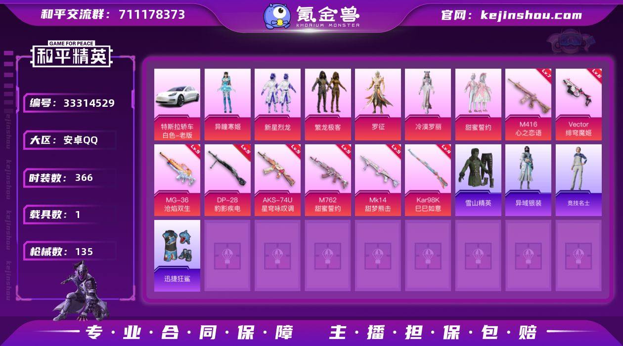 【特价出售】安卓Q-1载具6粉装8特效枪8热门93套装135枪皮 44598热力值 4印记 历史传奇王牌12星 【1载具】 特斯拉3白色 【6粉装】 异瞳寒姬 罗征 冷漠罗丽 新星烈龙 甜蜜誓约 繁龙极客 【8特效枪】 M416-心之恋语 (7级) AKS-74U-星穹咏叹调 (5级) Kar98K-巳巳如意 (4级) Vector-绯穹魔姬 (6级) M762-甜蜜誓约 (5级) MG-36-沧焰双生 (5级) DP-28-豹影疾电 (5级) Mk14-甜梦熊击 (5级) 【8热门】 雪山精英 迅捷狂鲨 暗夜契约 纯白誓言 机械英豪 破蛋小黄鸡 弄潮海豚 Kar98K-深海曼妙 【1飞行器】 繁龙极客飞行器 【3背包】 深海小丑鱼背包 神秘黑猫背包 甜蜜誓约背包