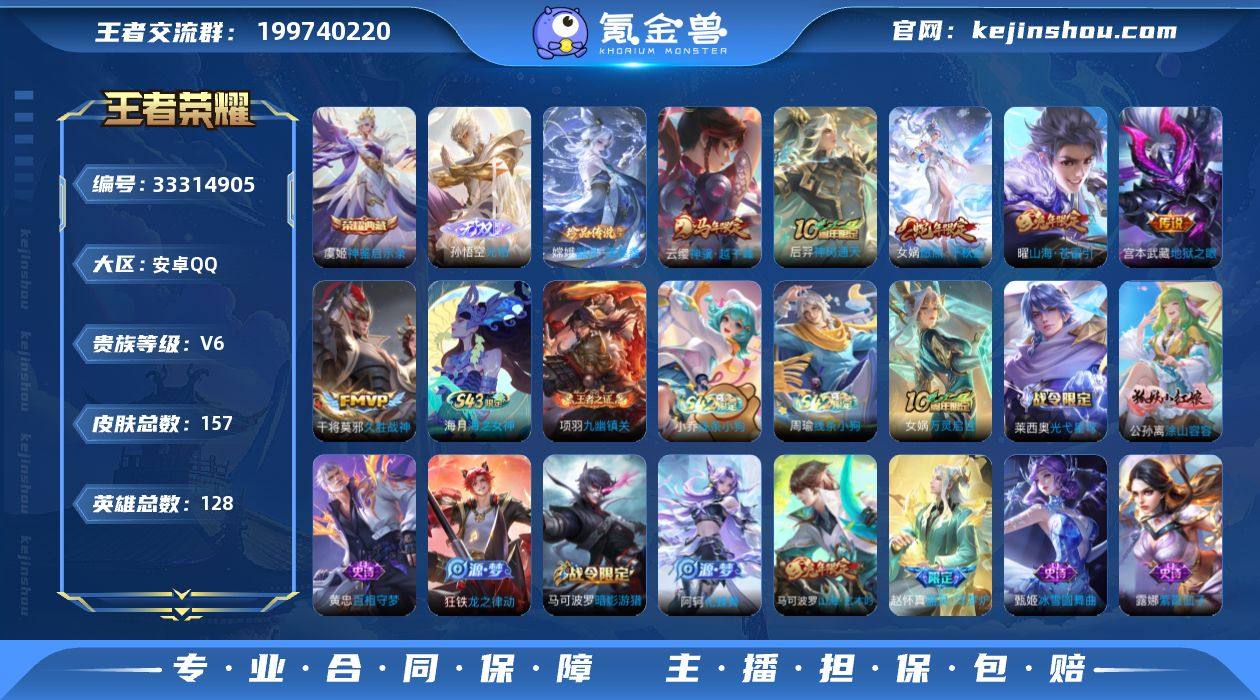 【955873】V6 1典藏 1无双 1珍品传说 6传说 128英雄 157皮肤 不可二次 不可修改实名 男号 【英雄全皮】孙权全皮,蚩奼全皮,大禹全皮 【稀有英雄】大司命,嬴政(始皇帝),韩信(韩跳跳),夏洛特(夏师傅),艾琳,橘右京(橘子),娜可露露(鸟人),不知火舞,赵云,金蝉(唐僧),戈娅 【荣耀水晶】神鉴启示录 【无双皮】无相 【珍品传说】器灵·落星盏 【传说皮】神骥·越千峰,神树通天,地狱之眼,久胜战神,山海·苍雷引(电光曜子) 【珍宝阁皮】胡桃夹子 【赛季/战令皮】古海寻踪(s33),海盐诗旅(s30),擒涛扼浪(s31),探海日志(s32),剑破天穹(s35),天穹祈灯(s34),天穹之誓(s36),暖冬·兔眠,暗影游猎(游乐娃子),胡桃异想国 【史诗皮】海之女神,茶境仙,器灵·浮梦炉,化蝶舞,光弋星穹,线条小狗-周瑜,九幽镇关,线条小狗-小乔,万灵启世,涂山容容,龙之律动,百相守梦-黄忠,紫霞仙子,特工魅影,偶像歌手,末日机甲-吕布,猫狗日记-孙策,乱世虎臣,节奏热浪,摇滚巨星,水果甜心,功夫厨神,暗隐猎兽者,鬼剑武藏,乘风破浪,逐浪之夏,龙鼓争鸣,水晶猎龙者,金属风暴,圣诞恋歌,鹰眼统帅,魅力维加斯,黎明之约,未来纪元-赵云 【限定皮】愿照·千秋盛(女娲年限),山海·玄木吟(马可年限) 【普通皮】赤刃凌霄,谧流熔炉,访茗客,雪境奇...