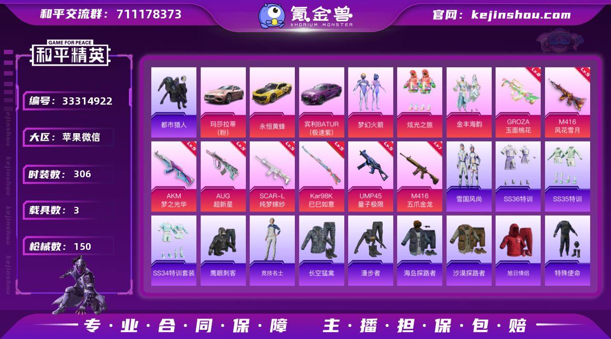 实名: 可修改 时装数: 306 载具数: 3 枪械数: 150 战备数: 3 热门装扮: 梦幻火箭(新101),鹰眼刺客,都市猎人,炫光之旅,金丰海韵 载具: 玛莎拉蒂Ghibli(粉),永恒黄蜂,宾利BATUR(极速紫) 稀有枪皮: M416五爪金龙,AKM梦之光华,M416风花雪月,SCAR-L纯梦嫁纱,GROZA玉面桃花,AUG超新星,UMP45量子极限,Kar98K-巳巳如意 亮点: 【优质装备】:Mark.06(新蓝螳螂),都市猎人,八级GROZA-玉面桃花