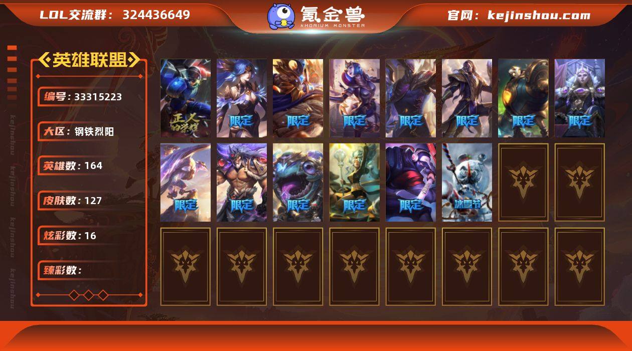 【LOLZ1463】164英雄/127皮肤/1神话/14限定/16炫彩/15传说/32史诗/未定级/10周年庆典 凤凰/雪默丁格/S1FNC 迦娜/S2 暗杀星 慎/胜利之树 茂凯/胜利女神 奥莉安娜/胜利之剑 亚托克斯/胜利枪神 卢锡安/胜利机器人 布里茨/胜利女神 瑟庄妮/胜利凤凰 艾尼维亚/胜利之王 泰达米尔/胜利巨口 克格莫/胜利女神 娑娜/防暴天使 凯尔/大天使长米迦勒 凯尔/战场女武神 凯尔/鬼魂新娘 莫甘娜/战地巨兽 科加斯/冰霜之刃 艾瑞莉娅/女警狙击 凯特琳/第三类接触 黑默丁格/屠龙勇士 潘森/黎明使者 锐雯/枯萎之壤 泽拉斯/苍穹之光 韦鲁斯/女校长 菲奥娜/星之守护者 金克丝/暗星 锤石/灵魂莲华 锤石/安伯斯与提妮/翼骑统领 赵信/铁血剑豪 易/钢铁之心 希维尔/紫晶射手 艾希/少林武僧 贾克斯/贵族血统 萨科/飞越疯人院 萨科/武动巅峰 萨科/穿着正装的恶魔 维迦/绝代智将 斯维因/抵抗军天使 凯特琳/黑曜石守护者 墨菲特/沙漠风暴 卡特琳娜/符文战神 雷克顿/死亡绽放 伊莉丝/灵骨工匠 奥莉安娜/三昧真火 孙悟空/防弹武僧 李青/屠龙勇士 薇恩/生化博士 黑默丁格/银色之牙 阿卡丽/刺客信条 锐雯/深海怪鱼 克格莫/钢之逆鳞 希瓦娜/野火之藤 婕拉/腥红之月 亚索/屠龙勇士 布隆/冲击之刃 劫/霸天剑魔 亚托克...