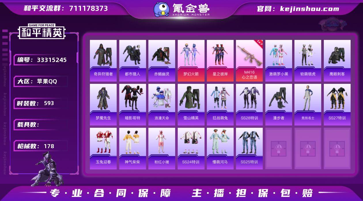 【特价出售】苹果Q-4稀有2粉装1特效枪22热门151套装178枪皮 55138热力值 7印记 历史超级王牌11星 【4稀有】 奇异狩猎者 赤蝎幽灵 都市猎人 浪漫天命 【2粉装】 梦幻火箭 星之彼岸 【1特效枪】 M416-心之恋语 (7级) 【22热门】 龟仙人 浪漫假日 雪山精英 梦魇先生 鹰眼刺客 软萌银虎 激萌罗小黑 暗影哥特 迪迦奥特曼 团圆交子 瑞龙福将 粉红小猪 漫步者 破蛋小黄鸡 风华少年志 白月香洋装 黑色刀锋 AKM-奇异狩猎者 M762-瑞龙福将 M24-奇异狩猎者 AUG-魔法学院 AUG-PEC最牛战神 【1头盔】 梦幻火箭头盔 【3背包】 九霄背包 梦幻火箭背包 神秘黑猫背包
