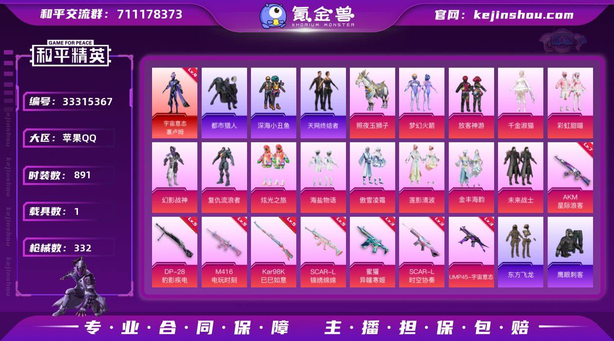 【特价出售】苹果Q-1红装5稀有1载具12粉装8特效枪23热门236套装332枪皮 108348热力值 20印记 历史绝世王牌20星 【1红装】 宇宙意志-塞卢姆 (4级) 【5稀有】 AWM-黄金龙骨 AKM-缤纷海域 都市猎人 浪漫天命 天网终结者 【1载具】 照夜玉狮子 【12粉装】 梦幻火箭 千金淑猫 金丰海韵 炫光之旅 幻影战神 放客神游 莲影清波 未来战士 傲雪凌霜 彩虹甜喵 海盐物语 复仇流浪者 【8特效枪】 SCAR-L-时空协奏 (3级) SCAR-L-锦绣绵绵 (5级) M416-电玩时刻 (5级) UMP45-宇宙意志 (3级) Kar98K-巳巳如意 (5级) DP-28-豹影疾电 (5级) 蜜獾-异瞳寒姬 (3级) AKM-星际浪客 (7级) 【23热门】 Mark.06 小丑鱼 龟仙人 暗夜之虎 东方飞龙 鹰眼刺客 暗夜之虎 深海小丑鱼 ST战队服 暗夜契约 团圆交子 瑞龙福将 纯白誓言 水银刺客 狂沙舞者 漫步者 破蛋小黄鸡 极速红龙 英勇保护者 弄潮海豚 AKM-奇异狩猎者 M762-奇异狩猎者 M762-瑞龙福将 【2飞行器】 梦幻火箭飞行器 深渊漩涡飞行器 【4头盔】 梦幻火箭头盔 深海小丑鱼头盔 金羽特工头盔 甜蜜誓约头盔 【4背包】 幻影战神背包 深海小丑鱼背包 金羽特工背包 甜蜜誓约背包
