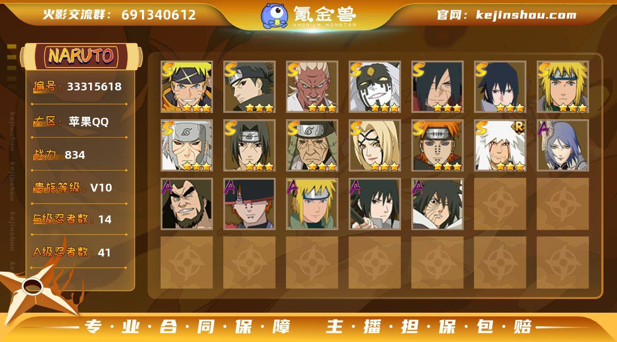 【火影忍者】战斗力:834W+;段位:见习1阶;本服排名:1127;VIP:V10级;S忍:14个;A忍:41个;通灵兽:21个,S忍:秽土转生解宇智波斑|白面具宇智波斑|秽土转生千手扉间|天道佩恩|漩涡鸣人宇智波佐助|须佐能乎宇智波止水|永恒万花筒宇智波佐助|忍界大战艾|舞之豪杰自来也|百豪纲手|波风水门|须佐能乎宇智波鼬|大筒木桃式|秽土转生猿飞日斩__A忍:青春爆炸迈特凯|仙人模式巳月|幻之真容旗木卡卡西|忍界大战李洛克|漂泊浪客佩恩六道|忍界大战日向宁次|四代目土影黑土|木叶上忍猿飞木叶丸|秽土转生迪达拉|宇智波止水(普通)|不风|青年波风水门|近松十人卫千代|半蛇斗篷药师兜|须佐能乎宇智波佐助|九尾查克拉漩涡鸣人|暴怒宇智波带土|晓大蛇丸|百豪春野樱|忍界大战秋道丁次|忍界大战我爱罗|万花筒写轮眼宇智波佐助|死司凭血飞段|疾风传我爱罗|飞段(普通)|小南(普通)|神驹佑将小南|迈特凯(普通)|宇智波鼬(普通)|干柿鬼鲛(普通)|蝎(普通)|猿飞阿斯玛(普通)|桃式显现漩涡博人|最终章日向雏田|六代目水影长十郎|不缘|宇智波泉奈|羁绊神农|忍界大战土台|初始形态机械鸣人|侠隐江湖大野木__通灵兽:忍犬(普通)|忍犬(普通)|蓝蛇|蛤蟆吉|忍龟|镰鼬|猿魔|山椒鱼|蜃|蛤...