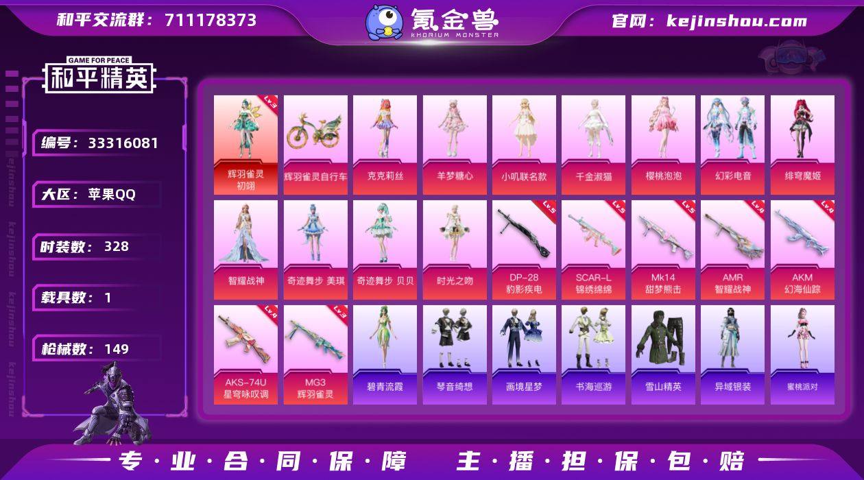 【特价出售】苹果Q-1红装1载具10粉装13特效枪3热门94套装149枪皮 52117热力值 5印记 历史卓越王牌11星 【1红装】 辉羽雀灵-初翊 (3级) 【1载具】 辉羽雀灵自行车 【10粉装】 奇迹舞步贝贝 奇迹舞步美琪 绯穹魔姬 千金淑猫 时光之吻 小叽联名款 樱桃泡泡 羊梦糖心 智耀战神 幻彩电音 【13特效枪】 SCAR-L-锦绣绵绵 (5级) AKS-74U-星穹咏叹调 (4级) AKM-幻海仙踪 (4级) MG-36-幻彩电音 (3级) MG3-辉羽雀灵 (3级) DP-28-豹影疾电 (5级) Mk14-樱桃泡泡 (5级) Mk14-甜梦熊击 (5级) AMR-智耀战神 (4级) Mk14-福马献瑞 (2级) UMP45-萌骑冒险 (4级) ACE32-萌骑漫游 (4级) 平底锅-喜羊羊与灰太狼 (3级) 【3热门】 雪山精英 浪漫波比 破蛋小黄鸡 【1头盔】 幻影战神头盔