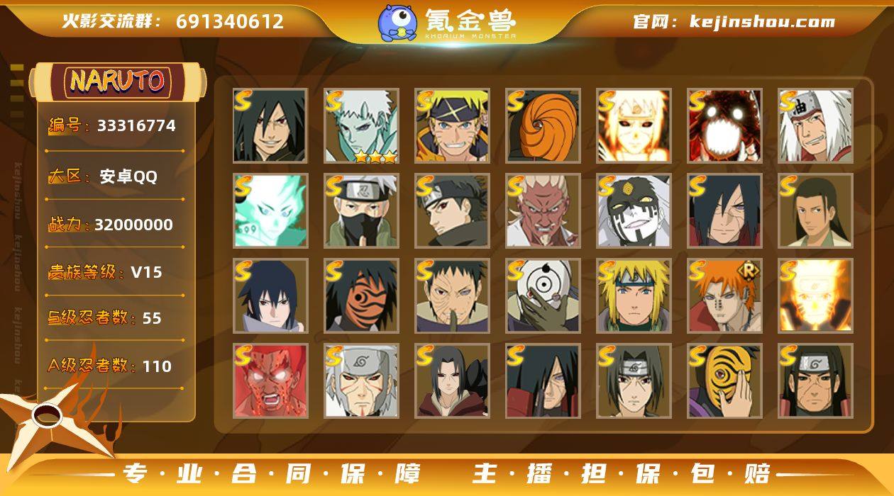 实名: 可修改 贵族等级: V15 S忍数: 55 A忍数: 110 战力值(万): 3200 战力排行: 本服前一百 S级忍者: 千手柱间「秽土转生」,罗砂「四代目风影」,宇智波鼬「秽土转生」,佩恩·天道「超」,药师兜「仙人模式」,宇智波斑「秽土转生」,艾「三代目雷影」,宇智波斑 「木叶创立」,半藏「秽土转生」,千手扉间「秽土转生」,纲手「百豪」,无「二代目土影」,波风水门「秽土转生」,金角/银角「秽土转生」,猿飞日斩「秽土转生」,长门「秽土转生」,宇智波斑,千手柱间,艾「四代目雷影」,千手扉间,神秘面具男,鬼灯幻月「二代目水影」,佩恩「天道」,大蛇丸,波风水门,纲手,自来也,宇智波鼬 「须佐能乎」,大野木「三代目土影」,自来也「仙人模式」,猿飞日斩,迈特凯「死门」,大野木 「忍界大战」,宇智波带土 「忍界大战」,自来也 「舞之豪杰」,宇智波斑「白面具」,漩涡鸣人 「九喇嘛连结」,大筒木金式「博人传」,春野樱 「忍界大战」,神秘面具男 「红夜之刃」,宇智波佐助「永恒万花筒」,千手柱间·木叶创立,宇智波斑「秽土转生·解」,大筒木桃式,艾「忍界大战」,宇智波止水「须佐能乎」,旗木卡卡西「须佐能乎」,大筒木舍人 「最终章」,自来也 「传说中的三忍」,漩涡鸣人 「暴怒·第六尾」,波风水门「九...