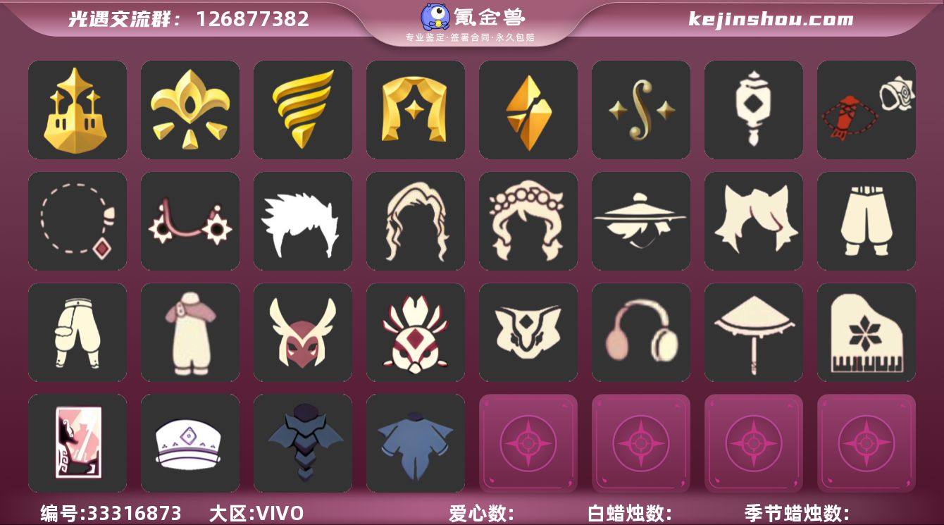 KD0017 vivo【毕业图】晨岛,云野,雨林,霞谷,暮土,禁阁 【毕业季】预言季,梦想季,集结季,潜海季,表演季,破晓季,二重奏季 【蜡烛】36 【爱心】56 【稀有礼包】兔子拖鞋,彩虹耳钉,日光耳环,圣诞鹿角,贝壳发饰,大橘大利,鲤跃龙门,四叶草头饰,TGC斗篷黑,创始人斗篷,小王子斗篷,福娃礼包,中秋灯笼,情人秋千,花憩茶桌 【毕业物品】手拍大鼓,阿努比斯,凤凰面具,凤凰斗篷,队长面具,双耳锅帽子,小号,斜边队长斗篷,小王子发型,潜水面具,单边小辫,暗红斗篷,帝企鹅发,黄眉企鹅面具,燕尾斗篷,双翼遥鲲斗,冥龙斗篷,二重奏三角,蓝色燕尾斗篷,二重奏海报,荧光长发,花瓣镂空斗篷 【热门复刻】海洋斗,武士裤,正太头,虚荣,猫耳发型,背带裤,搓澡巾,花环长发,红耳机,箬笠,平顶帽,雨伞,高音钢琴,白金斗篷,黑金斗篷,红金斗篷,黄鼠狼面具,女巫发型,樱花发型,红吉他,蓝色音乐符,书虫发型,道袍 /云野/雨林/霞谷/墓土/禁阁/梦想季/集结季/潜海季/表演季/破晓季/二重奏季/阿努比斯(狗头)/凤凰面具/凤凰斗篷/队长面具/小王子发型/单边小辫/暗红斗篷/黄眉企鹅面具/燕尾斗篷/冥龙斗篷/鲤鱼套/圣诞鹿角/彩虹耳钉/日光耳环/灯笼/花憩茶...
