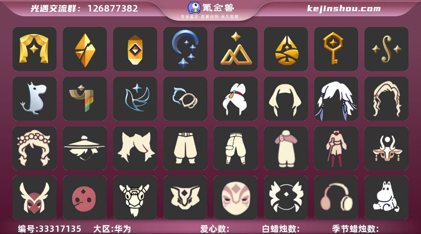 KK0013 华为【毕业图】晨岛,云野,雨林,霞谷,暮土,禁阁 【毕业季】潜海季,表演季,破晓季,欧若拉,追忆季,夜行季,拾光季,归巢季,九色鹿,筑巢季,二重奏季,姆明季,彩染季,青鸟季,双星季,迁徙季,织光季 【蜡烛】1002 【爱心】468 【稀有礼包】雪人头饰,贝壳发饰,四叶草头饰,云音伴游耳机 【毕业物品】潜水面具,单边小辫,暗红斗篷,帝企鹅发,黄眉企鹅面具,燕尾斗篷,双翼遥鲲斗,冥龙斗篷,留辫蘑菇头,高领舞服,透明蝶翼斗,肩带,追忆之书,棕熊面具,绒毛斗篷,西部帽,粗框眼镜,季卡相机,五塑彩带斗,五塑彩羽发,飘带斗篷,柔缎花边连体,飞天盘发,光之子试衣,设计师长袍,二重奏三角,蓝色燕尾斗篷,二重奏海报,姆明抱枕,姆明大伞,妮妮长裙,辉光羚羊面具,彩染围巾斗篷,青鸟面饰,青鸟斗篷,蓝色星星光环,暮星斗篷,海牛鹿角头饰,蓝色毛绒短靴,蓝色毛绒裤子,裂纹面具,荧光长发,花瓣镂空斗篷 【热门复刻】绿芽,海洋斗,击剑裤,武士裤,正太头,虚荣,猫耳发型,背带裤,搓澡巾,花环长发,红耳机,箬笠,平顶帽,雨伞,高音钢琴,白金斗篷,黑金斗篷,红金斗篷,黄鼠狼面具,疯帽匠发型,女巫发型,失孤发型,樱花发型,红吉他,...