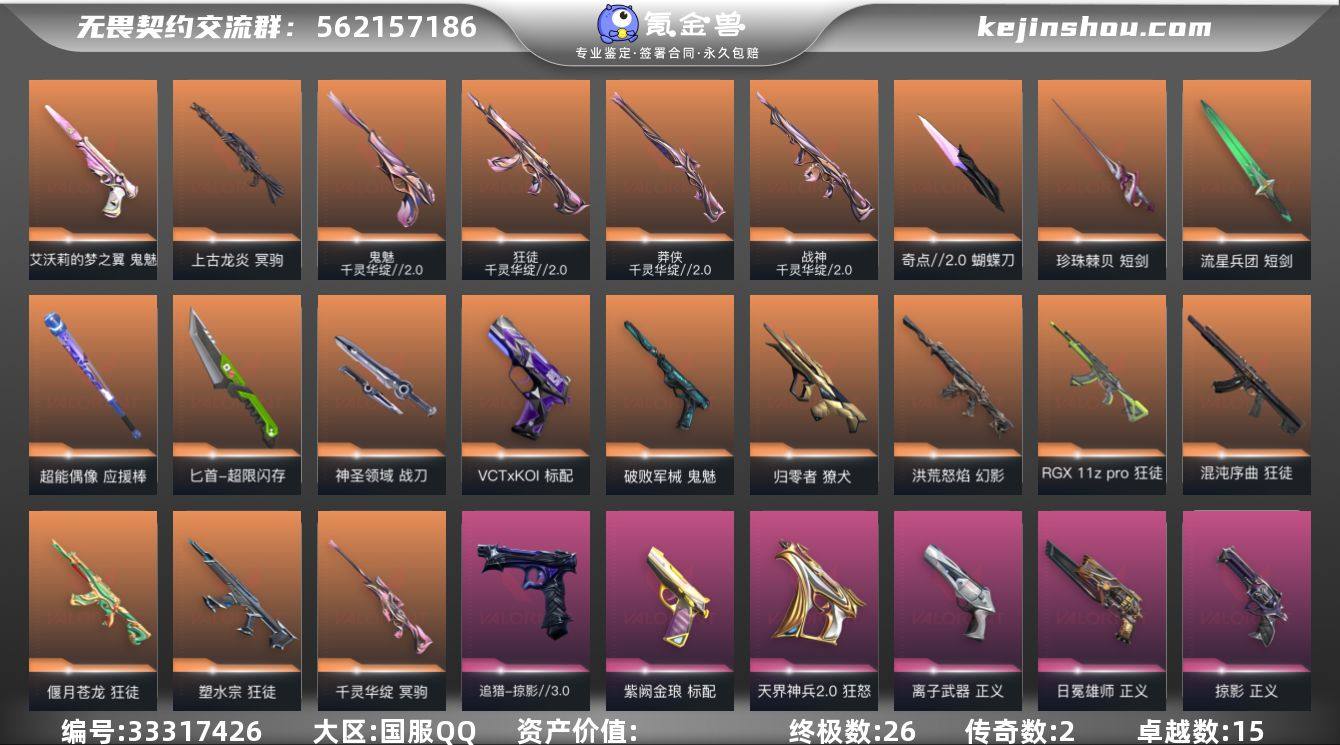 【6.4w库存天御刀.电工钳.掠夺蝴蝶刀.剥皮小刀.莲花扇.落英飞旋.八狂徒.双幻影塑水宗.混沌.显卡.盖亚.猴子.流脓幻影.天界】YXy6127【无二次】【因赛季更新游戏段付以上号为准!】 【套装】:千灵华绽//2.0套装,掠影//3.0套装,天界神兵//2.0套装 【英雄】:幻棱,炼狱,维斯,暮蝶,钛狐,壹决,铁臂,捷风,雷兹,幽影,不死鸟,贤者,猎枭,蝰蛇,零,芮娜,奇乐,尚勃勒,霓虹,斯凯,夜露,星礈,K/O,海神,盖可,黑梦,钢锁 【近战武器】:近战武器-影蝶,近战武器-流风回雪,近战武器-魔术火花,近战武器-剥皮小刀,近战武器-奇点//2.0 蝴蝶刀,近战武器-落英飞旋,近战武器-珍珠棘贝 短剑,近战武器-流星兵团 短剑,近战武器-超能偶像 应援棒,近战武器-超限闪存 匕首,近战武器-天御刀,近战武器-神圣领域 战刀,近战武器-魔术火花 【狂徒】:狂徒-混沌序曲,狂徒-塑水宗,狂徒-偃月苍龙,狂徒-RGX 11z Pro,狂徒-千灵华绽//2.0,狂徒-盖世英雄,狂徒-盖亚的复仇,狂徒-离子武器//2.0,狂徒-超能偶像,狂徒-流星兵团 【幻影】:幻影-洪荒怒焰,幻影-天界神兵//2.0,幻影-超限闪存,幻影-珍珠棘贝,幻影-神圣领域,幻影-聚合之力 【戍卫】:戍卫-超能偶像,戍卫-珍珠...