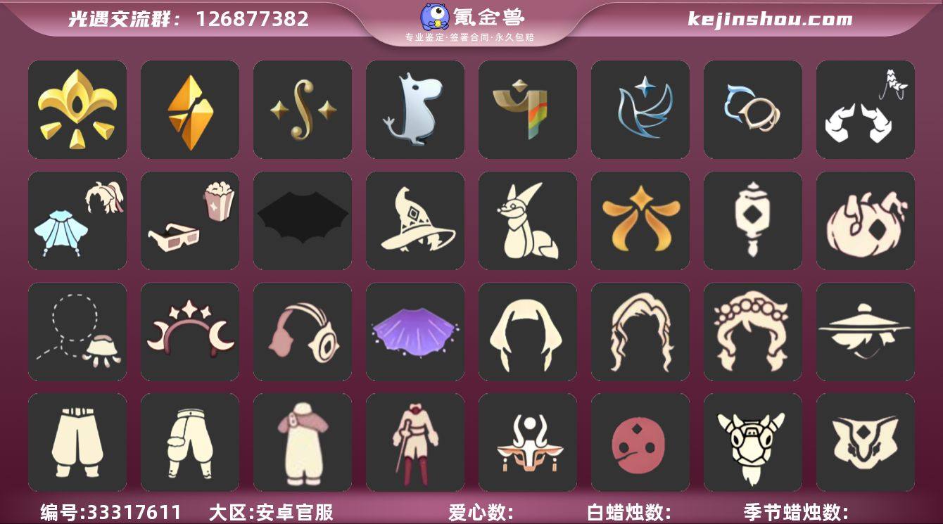 KK0020 安官 【毕业图】晨岛,云野,雨林,霞谷,暮土,禁阁 【毕业季】梦想季,集结季,破晓季,欧若拉,九色鹿,二重奏季,姆明季,彩染季,青鸟季,双星季,织光季 【蜡烛】51 【爱心】156 【稀有礼包】彩虹武士裤,兔子拖鞋,跃动跑鞋,星月头冠,神鹿祝福礼包,彩虹耳饰,彩虹耳机,爱心眼镜,水母肩饰,奔离远行发,巫师帽,贝壳发饰,雪花发夹,玉兔发饰,四叶草头饰,TGC斗篷黑,创始人斗篷,小王子围巾,欧若拉之翼,蝙蝠斗,浪漫流星斗篷,绊爱礼包,中秋灯笼,夏日阳伞,情人秋千,狐狸背包,冥龙南瓜,猫咪背饰,大橘大利,南瓜头,必胜客联动披萨,青衫落拓礼包,周年影院套餐礼包,金鳞耳饰,福娃礼包,冥龙套装,暖冬围巾斗篷,雪人头饰,暖冬绒绒礼包,云音伴游耳机 【毕业物品】凤凰面具,凤凰斗篷,丛林黑面具,六边锅帽子,胜利号角,连帽斗篷,双翼遥鲲斗,冥龙斗篷,留辫蘑菇头,高领舞服,透明蝶翼斗,肩带,九色鹿飞天斗篷,九色鹿丝带裤,九色鹿丸子头,白色高脚钢琴,蓝色燕尾服,合奏挂画,姆明抱枕,姆明大伞,妮妮长裙,彩染围巾斗篷,辉光羚羊面具,青鸟斗篷,青鸟面饰,蓝色星星光环,暮星斗篷,蓝色毛绒绒鞋,蓝色毛绒裤子,裂纹面具,荧光长...