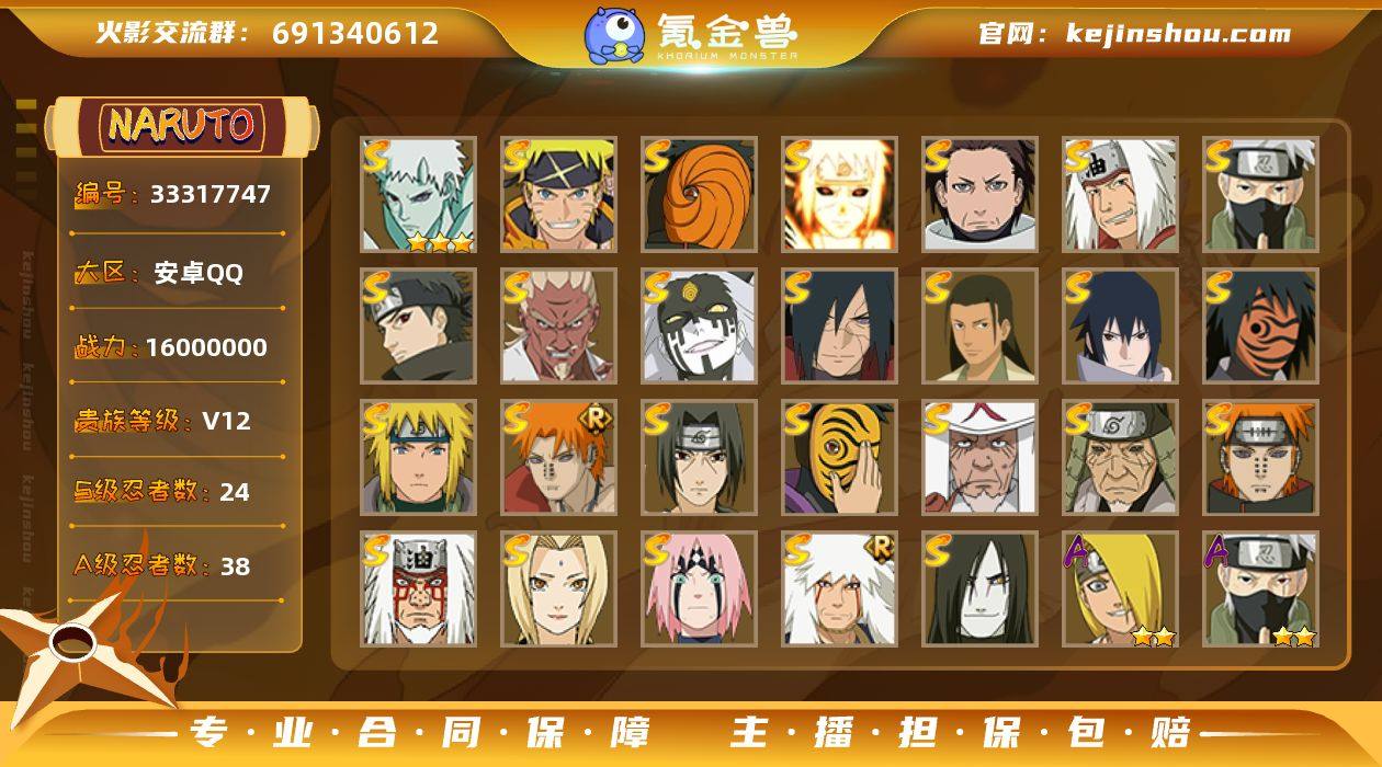 实名: 可修改 贵族等级: V12 S忍数: 24 A忍数: 38 战力值(万): 1600 战力排行: 本服前一百,榜单前20 S级忍者: 佩恩·天道「超」,猿飞日斩「秽土转生」,神秘面具男,佩恩「天道」,大蛇丸,波风水门,纲手,宇智波鼬 「须佐能乎」,自来也「仙人模式」,猿飞日斩,自来也 「舞之豪杰」,春野樱 「忍界大战」,神秘面具男 「红夜之刃」,宇智波佐助「永恒万花筒」,千手柱间·木叶创立,宇智波斑「秽土转生·解」,大筒木桃式,艾「忍界大战」,宇智波止水「须佐能乎」,旗木卡卡西「须佐能乎」,自来也 「传说中的三忍」,烈斗「初代目风影」,波风水门「九喇嘛连结」,宇智波斑「五影会谈」,漩涡鸣人·宇智波佐助,宇智波带土「十尾人柱力」 通灵兽: 熊猫,鵺