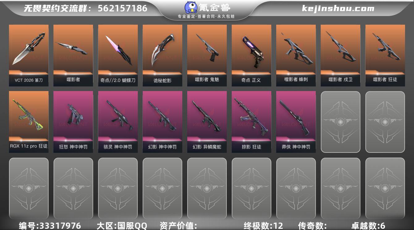 【套装】:VCT 2026 赛季套装,噬影者套装,神中神罚套装 【英雄】:幻棱,炼狱,维斯,暮蝶,钛狐,壹决,铁臂,捷风,雷兹,幽影,不死鸟,贤者,猎枭,蝰蛇,零,芮娜,奇乐,尚勃勒,霓虹,斯凯,夜露,星礈,K/O,海神,盖可,黑梦,钢锁 【近战武器】:近战武器-VCT 2026 篆刀,近战武器-神之刃,近战武器-奇点//2.0 蝴蝶刀,近战武器-噬影者 簇刃,近战武器-鬼丸国纲,近战武器-诡秘蛇影 军刀 【狂徒】:狂徒-噬影者,狂徒-RGX 11z Pro,狂徒-掠影,狂徒-诡秘蛇影 【幻影】:幻影-异鳞魔蛇,幻影-神中神罚,幻影-末日之翼 【戍卫】:戍卫-噬影者,戍卫-折光棱晶 【飞将】:飞将-末日之翼 【莽侠】:莽侠-神中神罚,莽侠-诡秘蛇影 【奥丁】:奥丁-末日之翼 【判官】:判官-诡秘蛇影 【骇灵】:骇灵-神中神罚 【蜂刺】:蜂刺-噬影者,蜂刺-折光棱晶 【标配】:标配-折光棱晶 【正义】:正义-奇点,正义-纳米打击 【鬼魅】:鬼魅-噬影者,鬼魅-诡秘蛇影 【狂怒】:狂怒-神中神罚 【短炮】:短炮-末日之翼 【卡面】:进入射程 卡面,《双城之战》拥抱 卡面,精灵大战 卡面,欢迎来到底城 卡面,南瓜盛典 卡面,修车达人 卡面,热舞环节 卡面,正义的化身 卡面,归乡 // 蝰...