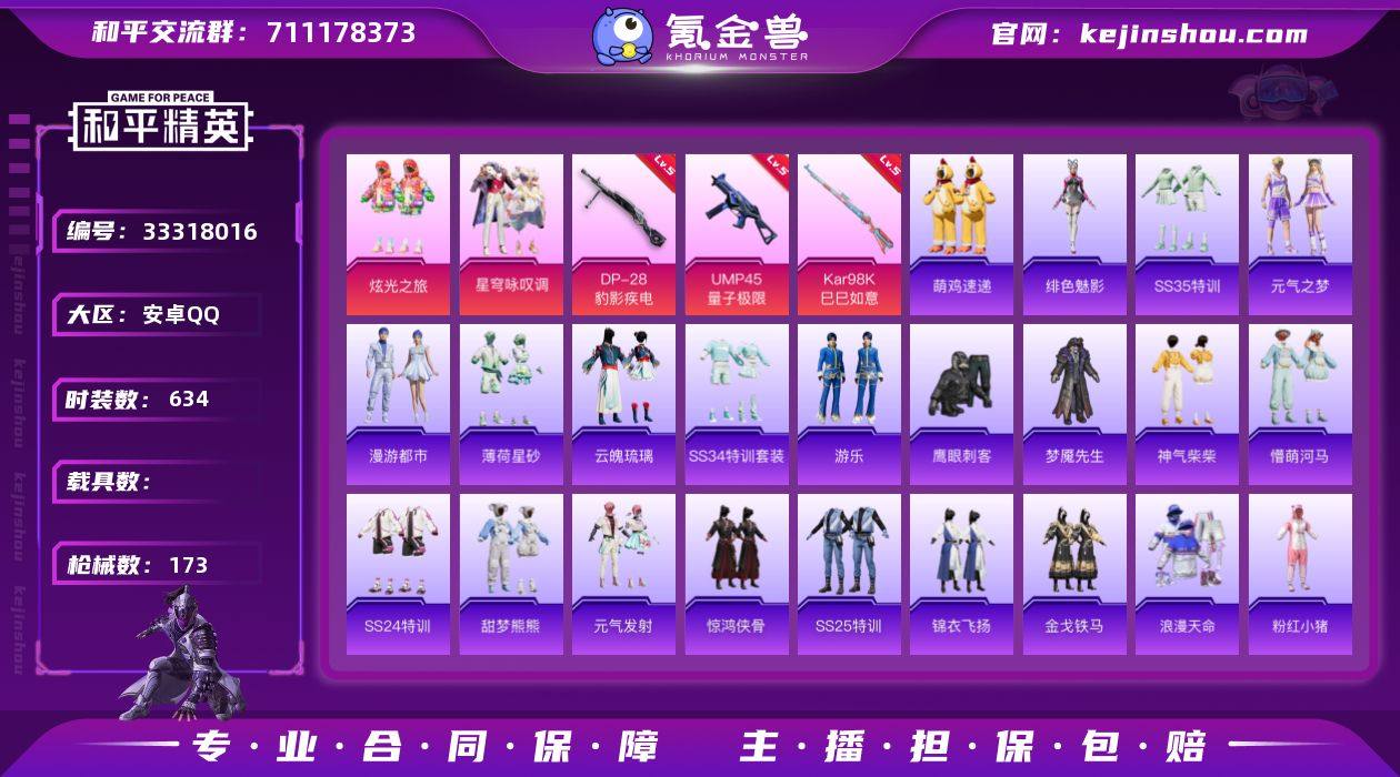 时装数: 634 枪械数: 173 战备数: 133 热门装扮: 梦魇先生,鹰眼刺客,炫光之旅,星穹咏叹调 稀有枪皮: UMP45-量子极限(五级),Kar98K-巳巳如意(五级),DP-28-豹影疾电(五级)