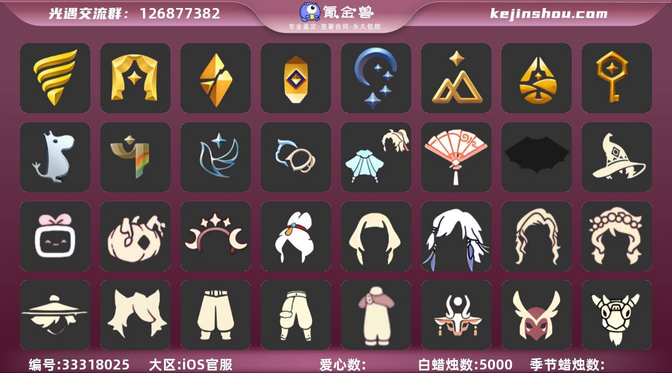 蜡烛数:5000/云野/雨林/霞谷/墓土/禁阁/潜海季/表演季/破晓季/追忆季/夜行季/拾光季/归巢季/筑巢季/姆明季/彩染季/青鸟季/双星季/单边小辫/暗红斗篷/黄眉企鹅面具/燕尾斗篷/冥龙斗篷/留辫蘑菇头/高领舞服/透明蝶翼斗/肩带/追忆之书/棕熊面具/绒毛斗篷/西部帽/粗框眼镜/季卡相机/五塑彩羽发/五塑彩带斗/光之子试衣/设计师长袍/姆明大伞/姆明抱枕/辉光羚羊面具/彩染围巾斗篷/青鸟毕业面饰/青鸟斗篷/蓝色星星光环/暮星斗篷/神鹿祝福礼包/夏日有友礼包/巫师/星月头饰/巫树犄角/圣诞鹿角/南瓜/蝙蝠套/白雪斗篷/青衫落拓礼包/献瑞折扇礼包/花憩茶桌/冥龙南瓜/大铁头/武士裤/背带裤/搓澡巾/虚荣/花环/红耳机/若笠/平顶帽/白金斗篷/黑金斗篷/红金斗篷/雨伞/五周年裤子/星星面具/黄鼠狼/羊头面具/星月头冠/猫耳/归巢毕业发型/花环长发/飞天盘发/帝企鹅发/贝壳发饰/雪花发夹/围巾斗篷/瑞雪斗篷/雪花水晶球/情人秋千/瑞气纸伞