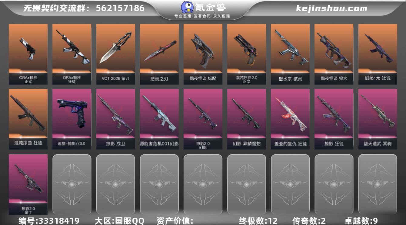 【套装】:VCT 2026 赛季套装,无畏契约季前邀请赛套装,回火礼包// V25套装,回火礼包:掠影套装,掠影//3.0套装 【英雄】:幻棱,炼狱,暮蝶,钛狐,壹决,捷风,雷兹,不死鸟,贤者,猎枭,芮娜,尚勃勒,霓虹,夜露,黑梦 【近战武器】:近战武器-碎心裂刃,近战武器-VCT 2026 篆刀,近战武器-影蝶,近战武器-无畏契约季前邀请赛 悲悯之刃,近战武器-紫金爪刀 【狂徒】:狂徒-混沌序曲,狂徒-创·纪元,狂徒-ORA x 颗秒,狂徒-掠影,狂徒-盖亚的复仇 【幻影】:幻影-源能者危机001,幻影-异鳞魔蛇,幻影-掠影//2.0 【戍卫】:戍卫-掠影 【獠犬】:獠犬-黯夜怪谈 【冥驹】:冥驹-堕天遗武 【奥丁】:奥丁-掠影//2.0 【骇灵】:骇灵-塑水宗 【追猎】:追猎-掠影//3.0 【标配】:标配-黯夜怪谈 【正义】:正义-混沌序曲//2.0,正义-ORA x 颗秒 【卡面】:Clutch 卡面,艺无止境//全球冠军赛 卡面,无畏契约GO!第一卷:芮娜 卡面,无畏契约GO!第一卷:零 卡面,代号红色 卡面,新兵报到 卡面,V契约 卡面,无畏契约 卡面 【喷漆】:买装还是存钱 喷漆,关门放狗 喷漆,红鳞 喷漆,无畏契约GO!第一卷:捷风 喷漆,暴走萝莉 喷漆,松叶 喷漆,放下武器 喷漆,胜利属于无畏契约...