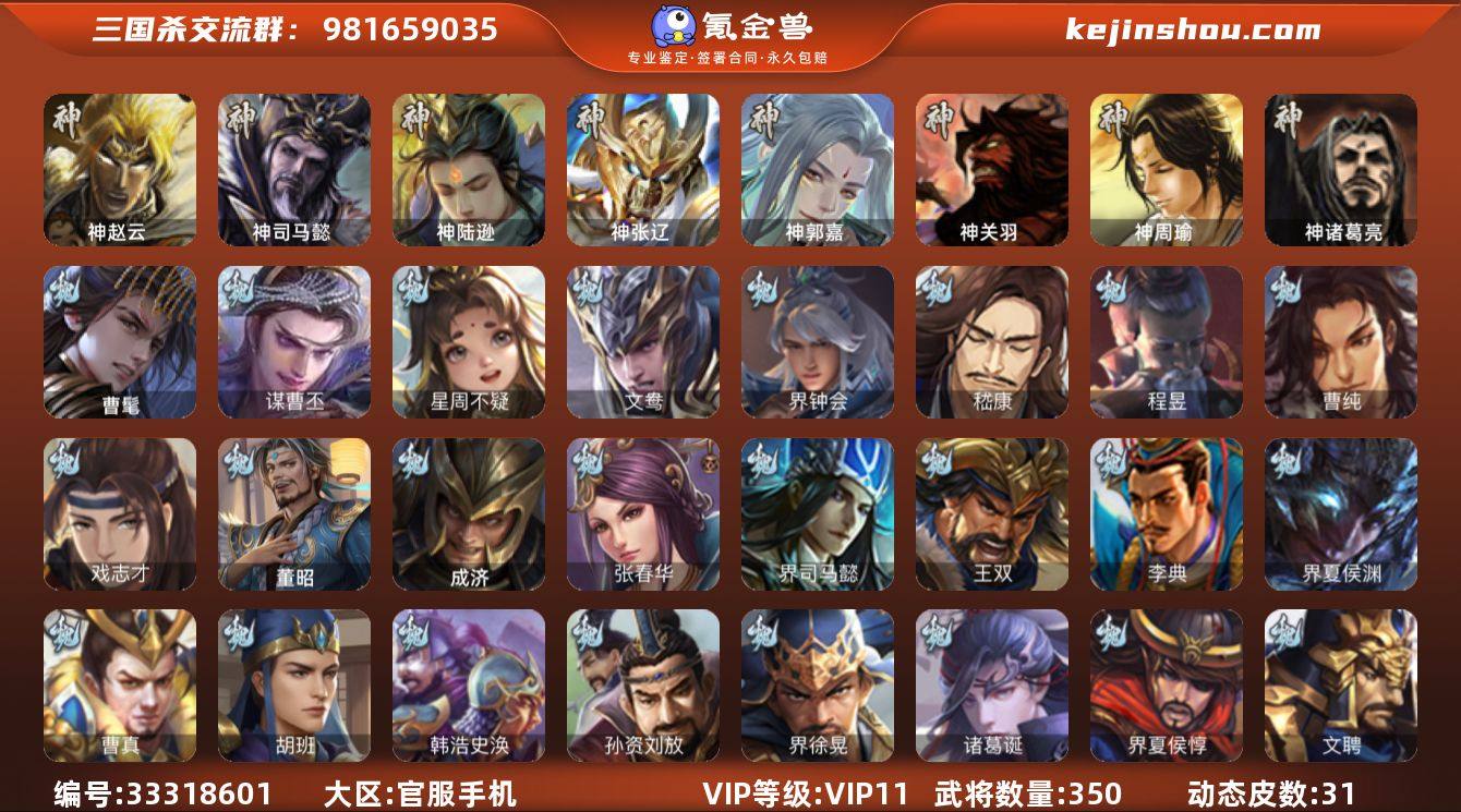 官阶:大将军;VIP等级:VIP11;史诗武将数量:30;动态皮肤数量:31;武将总数:350;史诗宝珠数量:9;将魂数量:2449;神将:6;魏国史诗武将:16;蜀国史诗武将:4;吴国史诗武将:6;群史诗武将:8 神赵云,神司马懿,神陆逊,神张辽,神郭嘉,神诸葛亮,曹髦,星周不疑,界钟会,嵇康,曹纯,戏志才,谋曹丕,程昱,谋马超,沙摩柯,界黄忠,谋关羽,周处,骆统,留赞,界徐盛,文鸯,谋公孙瓒,张让,麹义,沮授,界李儒,谋张角,许攸,兀突骨,神周瑜,神关羽,SP关羽,SP蔡文姬,乐进,曹昂,诸葛诞,朱灵,文聘,SP姜维,张春华,钟会,曹冲,郭淮,满宠,界王异,界曹操,界司马懿,界夏侯惇,界张辽,界许褚,界郭嘉,李典,曹真,韩浩史涣,陈群,曹叡,曹休,钟繇,司马朗,王基,李通,郭皇后,孙资刘放,辛宪英,界甄姬,吕虔,鲁芝,界典韦,界徐晃,杜畿,界曹丕,毌丘俭,界邓艾,张恭,界曹植,界郭淮,卞夫人,华歆,袁涣,王双,崔琰,毛玠,谋徐晃,谋甄姬,界曹休,牵招,胡班,成济,界夏侯渊,唐咨,董昭,SP孙尚香,夏侯霸,马良,关兴张苞,廖化,界马岱,关平,简雍,刘封,界法正,界关兴张苞,界刘备,界关羽,界张飞,界赵云,界马超,SP徐庶,吴懿,周仓,张松,刘谌,夏侯氏,糜竺,马忠,李严,黄皓,吴苋,秦宓,界黄月英,界诸葛亮,赵统赵广,严颜,界伊籍,界卧龙诸葛,界孟获,界祝...